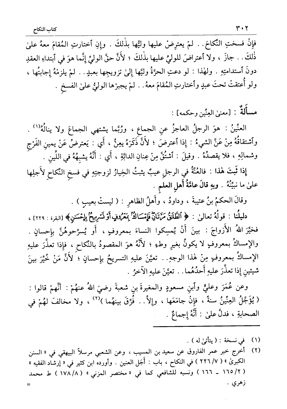وعن عمر وعلى وابن مسعود والمغيرة بن شعبة - رَضِيَ اللَّهُ عَنْهُمْ -: أنهم قالوا: (يؤجل العنين سنة، فإن جامعها، وإلا.. فرق بينهما) ، ولا مخالف لهم في الصحابة. فدل على: أنه إجماع.