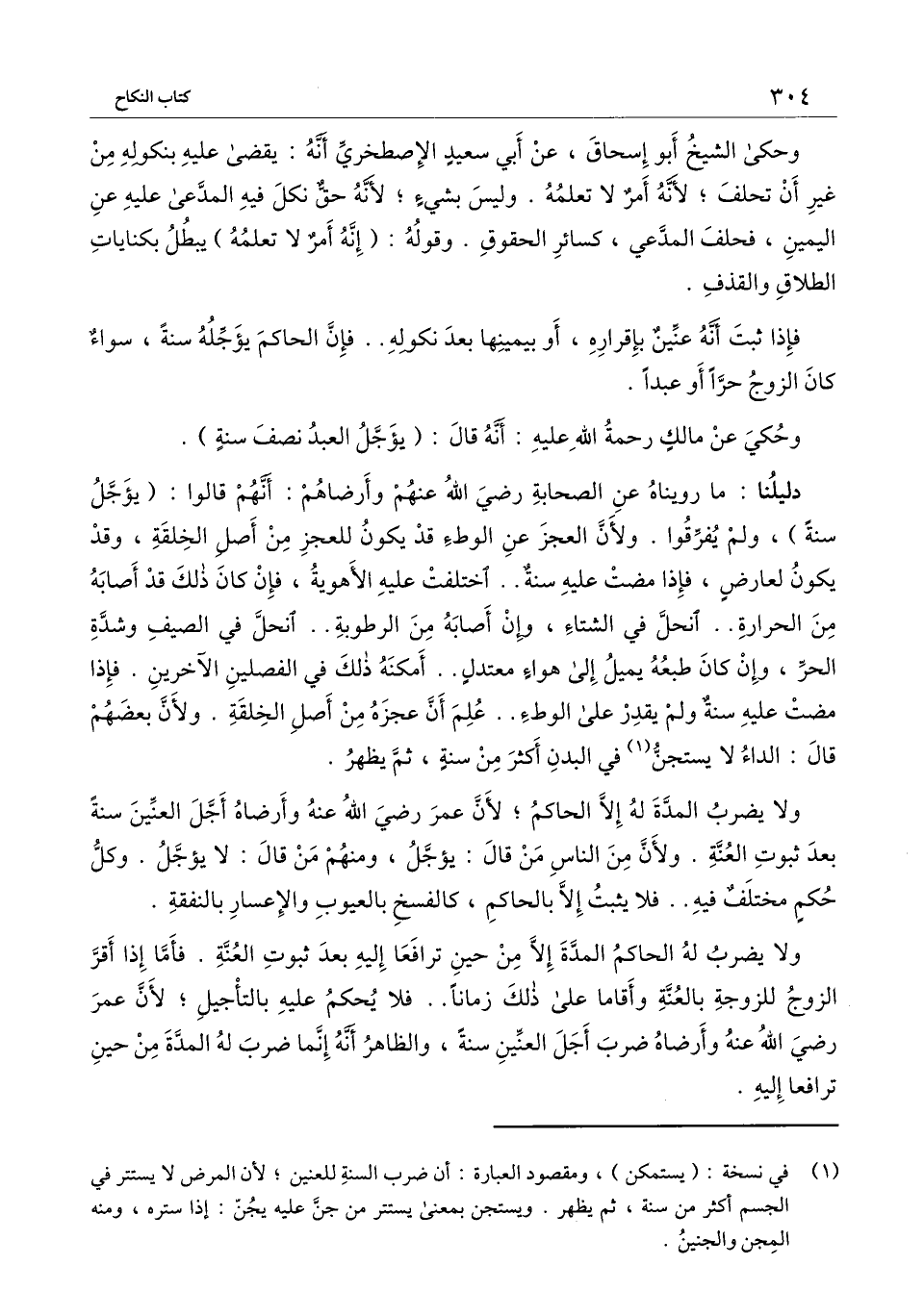 ولا يضرب له الحاكم المدة إلا من حين ترافعها إليه بعد ثبوت العنة. فأما إذا أقر الزوج للزوجة بالعنة وأقاما على ذلك زمانا.. فلا يحكم عيه بالتأجيل؛ لأن عمر - رَضِيَ اللَّهُ عَنْهُ - وأرضاه ضرب أجل العنين سنة، والظاهر أنه إنما ضرب له المدة من حين ترافعها إليه.