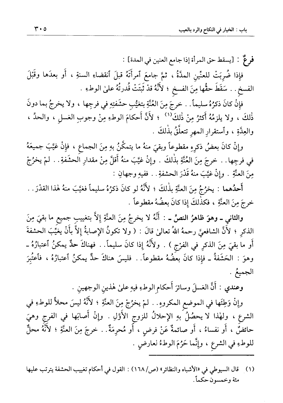 والثاني - وهو ظاهر النص -: أنه لا يخرج من العنة إلا بتغييب جميع ما بقي من الذكر؛ لأن الشافعي - رَحِمَهُ اللَّهُ تَعَالَى - قال: (ولا تكون الإصابة إلا بأن يغيب الحشفة أو ما بقي من الذكر في الفرج) . ولأنه إذا كان سليما.. فهناك حد يمكن اعتباره - وهو: الحشفة - فإذا كان بعضه مقطوعا.. فليس هناك حد يمكن اعتباره، فاعتبر الجميع.