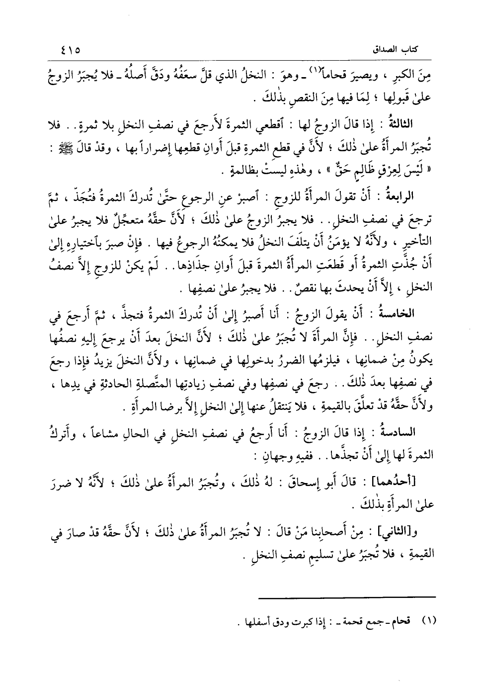 الرابعة: أن تقول المرأة للزوج: اصبر عن الرجوع حتى تدرك الثمرة فتجذ، ثم ترجع في نصف النخل.. فلا يجبر الزوج على ذلك؛ لأن حقه متعجل فلا يجبر على التأخير، ولأنه لا يؤمن أن يتلف النخل فلا يمكنه الرجوع فيها. فإن صبر باختياره إلى أن جذت الثمرة أو قطعت المرأة الثمرة قبل أوان جذاذها.. لم يكن للزوج إلا نصف النخل، إلا أن يحدث بها نقص.. فلا يجبر على نصفها.
