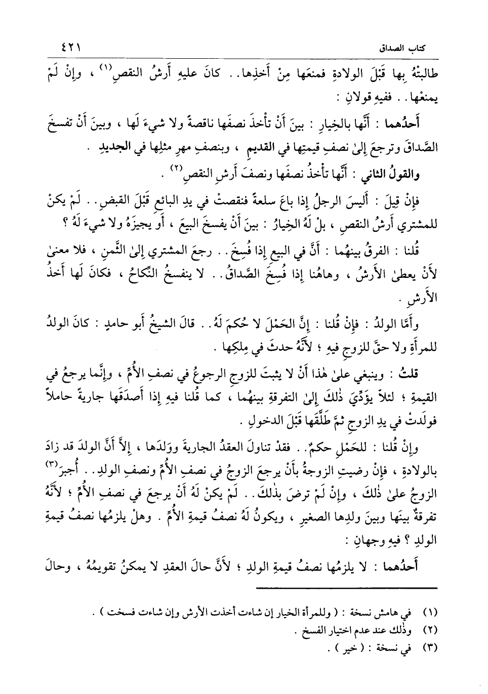 وإن قلنا: للحمل حكم.. فقد تناول العقد الجارية وولدها، إلا أن الولد قد زاد بالولادة، فإن رضيت الزوجة بأن يرجع الزوج في نصف الأم ونصف الولد.. أجبر الزوج على ذلك، وإن لم ترض بذلك.. لم يكن له أن يرجع في نصف الأم؛ لأنه تفرقه بينها وبين ولدها الصغير، ويكون له نصف قيمة الأم. وهل يلزمها نصف قيمة الولد؟ فيه وجهان: