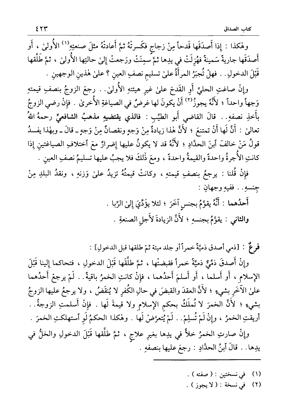 وإن صاغت الحلي أو القدح على غير هيئته الأولى.. رجع الزوج بنصف قيمته وجهًا واحدًا؛ لأنه يجوز أن يكون لها غرض في الصياغة الأخرى. فإن رضي الزوج بأخذ نصفه.. قال القاضي أبو الطيب: فالذي يقتضيه مذهب الشافعي - رَحِمَهُ اللَّهُ تَعَالَى -: أن لها أن تمتنع؛ لأن هذا زيادة من وجه ونقصان من وجه - قال - وبهذا يفسد قول من خالف ابن الحداد؛ لأنه قد لا يكون عليها إضرار مع اختلاف الصياغتين إذا كانت الأجرة واحدة والقيمة واحدة، ومع ذلك فلا يجب عليها تسليم نصف العين.