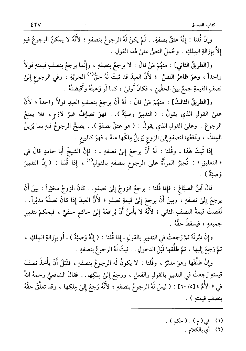 و (الطريق الثالث) : منهم من قال: له أن يرجع بنصف العبد قولًا واحدًا؛ لأن على القول الذي يقول: (التدبير وصية) .. فهو تصرف غير لازم، فلا يمنع الرجوع. وعلى القول الذي يقول: (هو عتق بصفة) .. يصح الرجوع فيه بما يزيل الملك، ودفعها لنصفه إلى الزوج يزيل ملكها عنه، فهو كالبيع.