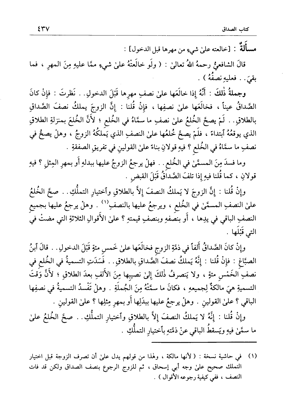 وإن كان الصداق ألفًا في ذمة الزوج فخالعها على خمسمائة قبل الدخول.. قال ابن الصباغ: فإن قلنا: إنه يملك نصف الصداق.. فسدت التسمية في الخلع في نصف الخمسمائة، ولا ينصرف ذلك إلى نصيبها من الألف بعد الطلاق؛ لأن وقت التسمية هي مالكة لجميعه، فكان ما سمته من الجملة. وهل تفسد التسمية في نصفها الباقي؟ على القولين. وهل يرجع عليها ببدلها أو بمهر مثلها؟ على القولين.