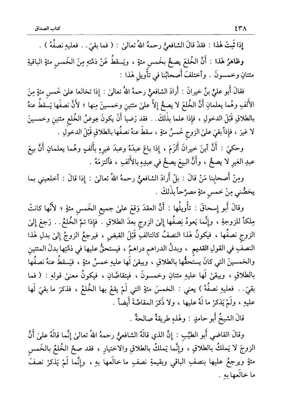 وقال أبو إسحاق: تأويلها: أن العقد وقع على جميع الخمسمائة؛ لأنها كانت ملكا للزوجة، وإنما يعود نصفها إلى الزوج بعد الطلاق. فإذا تم الخلع..رجع إلى الزوج نصفها، فيكون هذا النصف كالتالف قبل القبض، فيرجع الزوج إلى بدل هذا النصف في القول القديم، وبدل الدراهم دراهم، فيستحق عليها في ذمتها بدل المائتين والخمسين التي كان يستحقها بالطلاق، ويبقى لها عليه خمسمائة، فيسقط عنه نصفها بالطلاق، ويبقى لها عليه مئتان وخمسون، فيتقاصان، فيكون معنى قوله: (فما بقي.. فعليه نصفه) يعني: الخمسمائة التي لم يقع بها الخلع، فذكر ما بقي لها عليه، ولم يذكر ما له عليها، ولا ذكر المقاصة أيضًا.