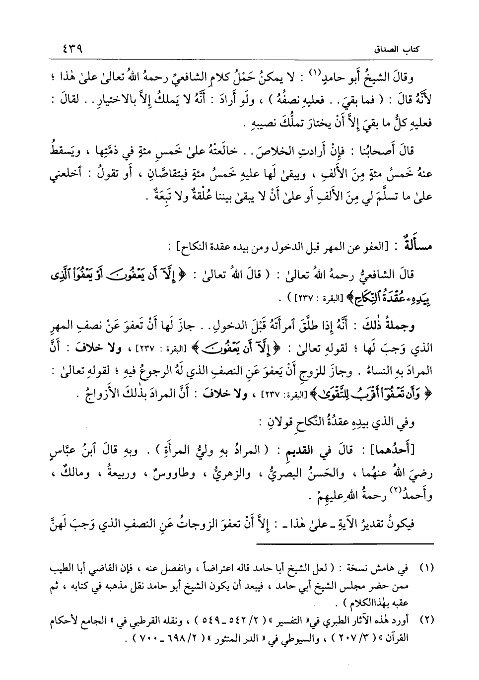 ) : قال الشافعي - رَحِمَهُ اللَّهُ تَعَالَى -: (قال الله تعالى: {إِلا أَنْ يَعْفُونَ أَوْ يَعْفُوَ الَّذِي بِيَدِهِ عُقْدَةُ النِّكَاحِ} [البقرة: 237] [البقرة 237] وجملة ذلك: أنه إذا طلق امرأته قبل الدخول.. جاز لها أن تعفو عن نصف المهر الذي وجب لها؛ لِقَوْلِهِ تَعَالَى: {إِلا أَنْ يَعْفُونَ} [البقرة: 237] البقرة [237] ، ولا خلاف: أن المراد به النساء. وجاز للزوج أن يعفو عن النصف الذي له الرجوع فيه؛ لِقَوْلِهِ تَعَالَى: {وَأَنْ تَعْفُوا أَقْرَبُ لِلتَّقْوَى} [البقرة: 237] [البقرة: 237] ، ولا خلاف: أن المراد بذلك الأزواج. وفي الذي بيده عقدة النكاح قولان: