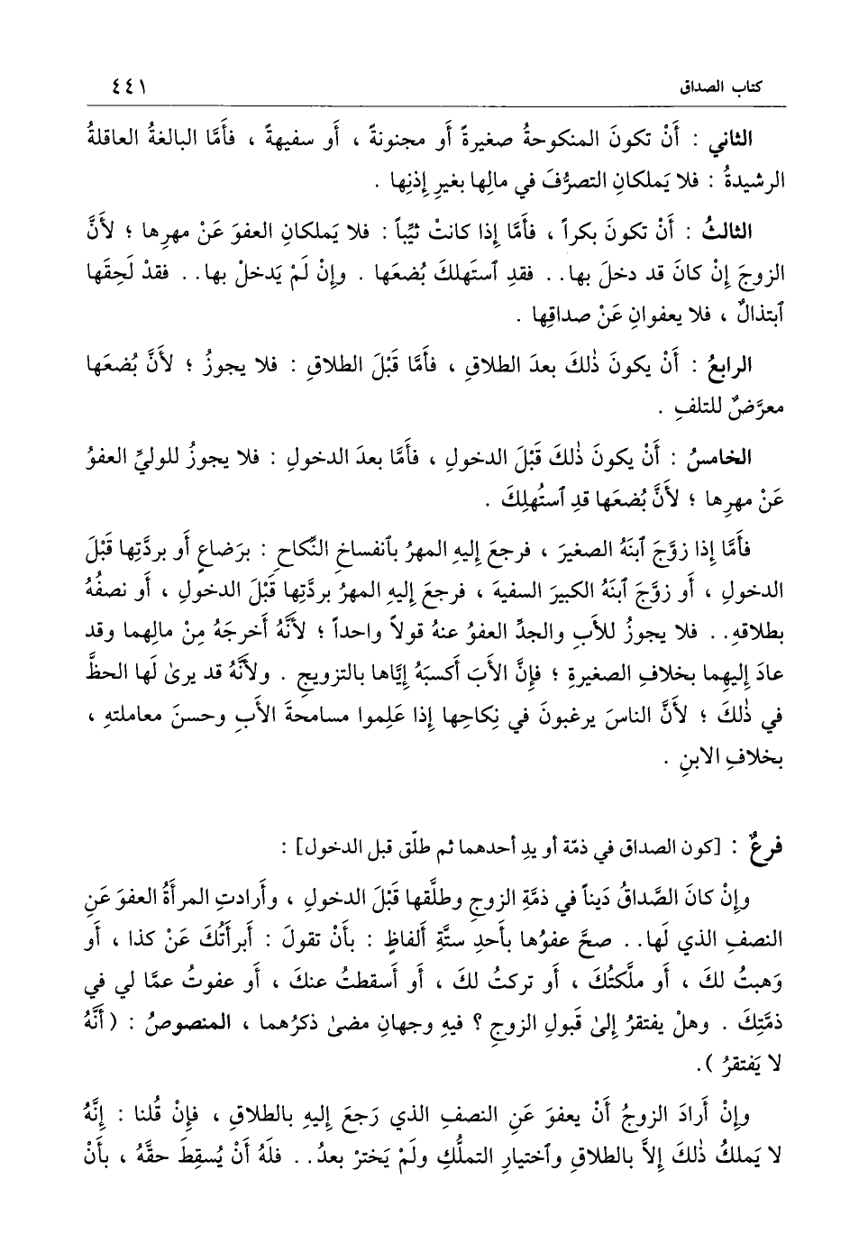 الرابع: أن يكون ذلك بعد الطلاق، فأما قبل الطلاق: فلا يجوز؛ لأن بضعها معرض للتلف. الخامس: أن يكون ذلك قبل الدخول، فأما بعد الدخول: فلا يجوز للولي العفو عن مهرها؛ لأن بضعها قد استهلك.