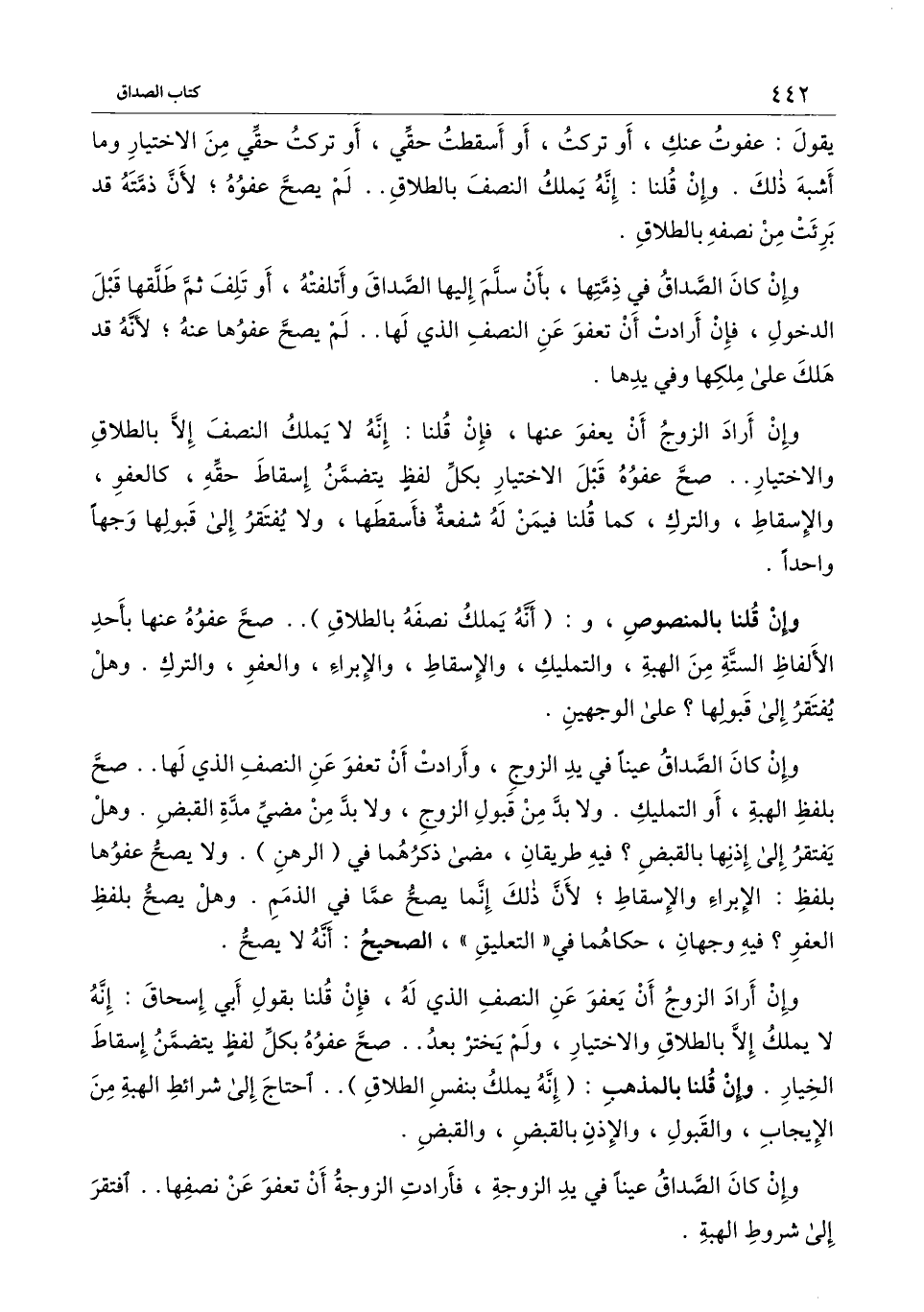 وإن أراد الزوج أن يعفو عن النصف الذي له، فإن قلنا بقول أبي إسحاق: إنه لا يملك إلا بالطلاق والاختيار، ولم يختر بعد.. صح عفوه بكل لفظ يتضمن إسقاط الخيار. وإن قلنا بالمذهب: (إنه يملك بنفس الطلاق) .. احتاج إلى شرائط الهبة من الإيجاب، والقبول، والإذن بالقبض، والقبض.