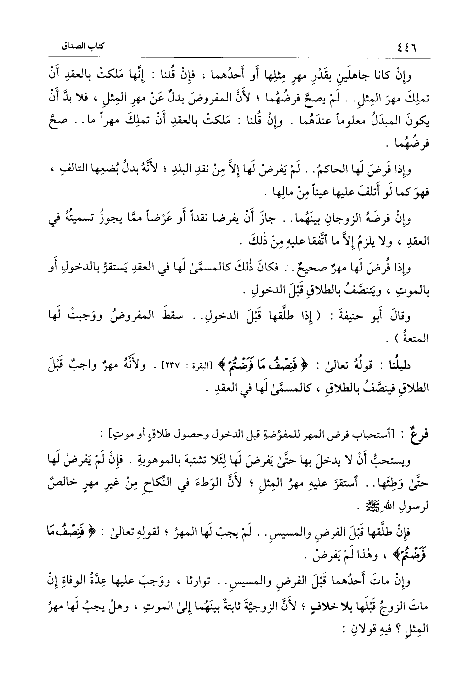 وإذا فرض لها مهر صحيح.. فكان ذلك كالمسمى لها في العقد يستقر بالدخول أو بالموت، ويتنصف بالطلاق قبل الدخول.