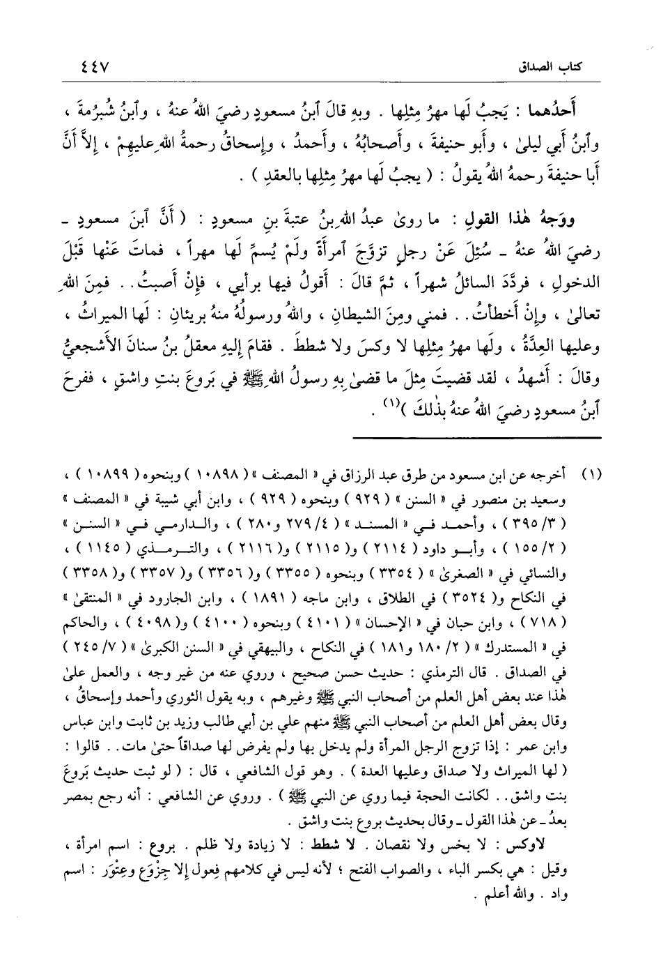ووجه هذا القول: ما روى عبد الله بن عتبة بن مسعود: (أن ابن مسعود- رَضِيَ اللَّهُ عَنْهُ - سئل عن رجل تزوج امرأة ولم يسمِّ لها مهرا، فمات عنها قبل الدخول، فردد السائل شهرًا، ثم قال: أقول فيها برأيي، فإن أصبت.. فمن الله تعالى، وإن أخطأت.. فمني ومن الشيطان، والله ورسوله منه بريئان: لها الميراث، وعليها العدة، ولها مهر مثلها لا وكس ولا شطط. فقام إليه معقل بن سنان الأشجعي وقال: أشهد، لقد قضيت مثل ما قضى به رسول الله - صَلَّى اللَّهُ عَلَيْهِ وَسَلَّمَ - في بروع بنت واشق، ففرح ابن مسعود - رَضِيَ اللَّهُ عَنْهُ - بذلك) .