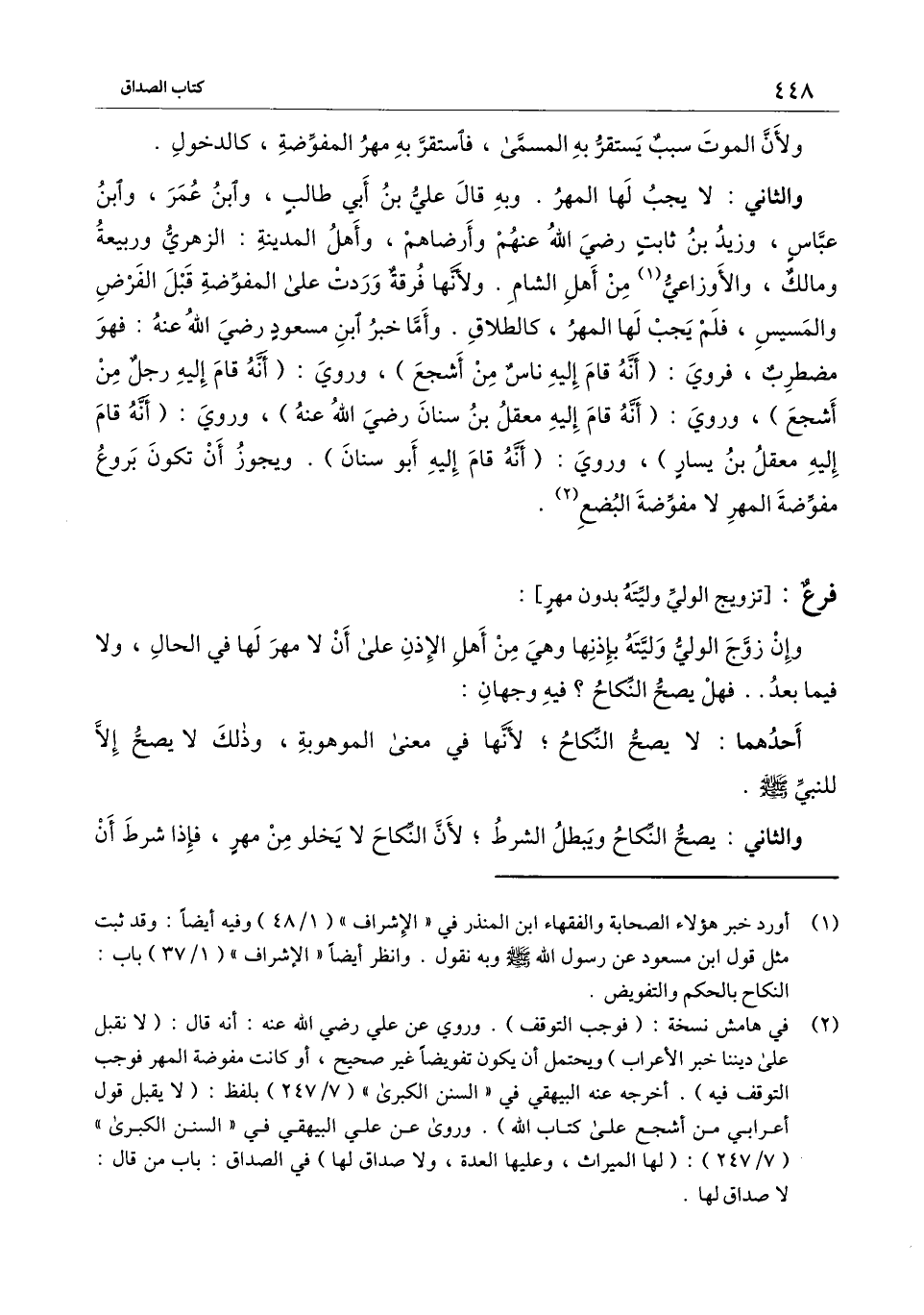 والثاني: لا يجب لها المهر. وبه قال علي بن أبي طالب، وابن عمر، وابن عباس، وزيد بن ثابت - رَضِيَ اللَّهُ عَنْهُمْ - وأرضاهم -، وأهل المدينة: الزهري وربيعة ومالك، والأوزاعي من أهل الشام. ولأنها فرقة وردت على المفوضة قبل الفرض والمسيس، فلم يجب لها المهر، كالطلاق. وأما خبر ابن مسعود - رَضِيَ اللَّهُ عَنْهُ - فهو مضطرب، فروي: (أنه قام إليه ناس من أشجع) ، وروي: (أنه قام إليه رجل من أشجع) ، وروي (أنه قام إليه معقل بن سنان - رَضِيَ اللَّهُ عَنْهُ -) ، وروي: (أنه قام إليه معقل بن يسار) ، وروي: (أنه قام إليه أبو سنان) . ويجوز أن تكون بروع مفوضة المهر لا مفوضة البضع.