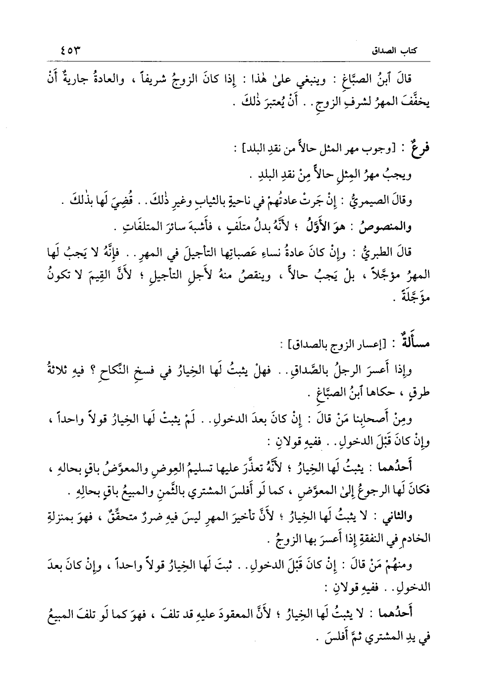 ) : وإذا أعسر الرجل بالصداق.. فهل يثبت لها الخيار في فسخ النكاح؟ فيه ثلاثة طرق، حكاها ابن الصباغ.