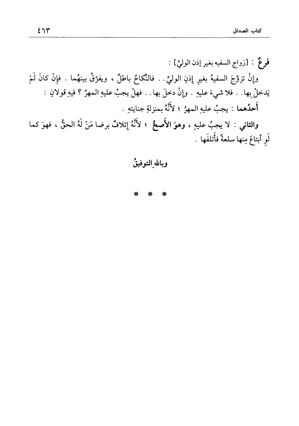 ) : وإن تزوج السفيه بغير إذن الولي.. فالنكاح باطل، ويفرق بينهما. فإن كان لم يدخل بها.. فلا شيء عليه. وإن دخل بها.. فهل يجب عليه المهر؟ فيه قولان: