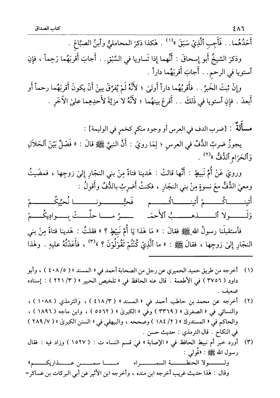 «وروي عن أم نبيط: أنها قالت: هدينا فتاة من بني النجار إلى زوجها، فمضيت ومعي الدف مع نسوة من بني النجار، فكنت أضرب بالدف وأقول: