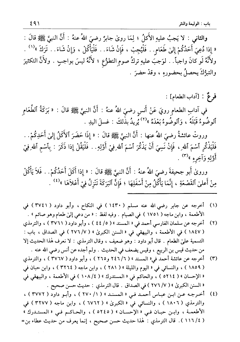 ) : في آداب الطعام روي عن أنس - رَضِيَ اللَّهُ عَنْهُ -: أن النبي - صَلَّى اللَّهُ عَلَيْهِ وَسَلَّمَ - قال: «بركة الطعام الوضوء قبله، والوضوء بعده» يريد بذلك: غسل اليد.