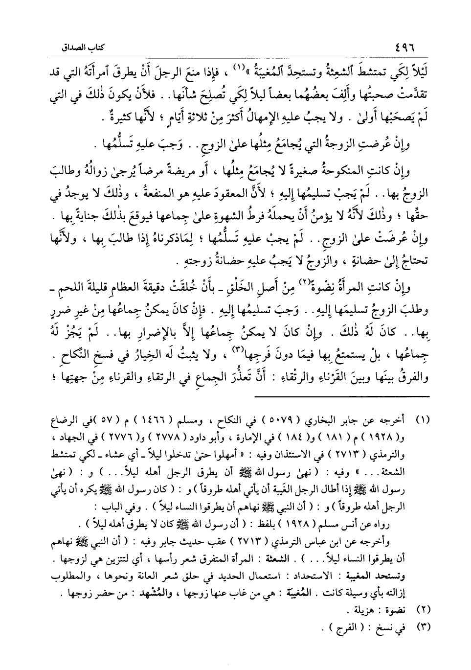 وإن كانت المرأة نضوة من أصل الخلق - بأن خلقت دقيقة العظام قليلة اللحم - وطلب الزوج تسليمها إليه.. وجب تسليمها إليه. فإن كان يمكن جماعها من غير ضرر بها.. كان له ذلك. وإن كان لا يمكن جماعها إلا بالإضرار بها.. لم يجز له جماعها، بل يستمتع بها فيما دون فرجها، ولا يثبت له الخيار في فسخ النكاح. والفرق بينها وبين القرناء والرتقاء: أن تعذر الجماع في الرتقاء والقرناء من جهتها؛