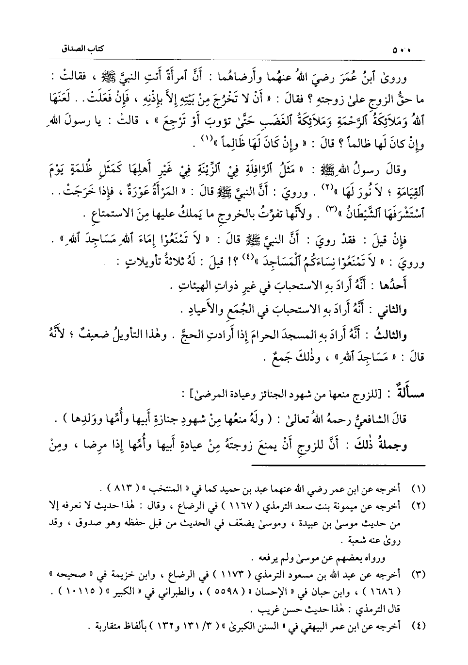 وروى ابن عمر - رَضِيَ اللَّهُ عَنْهُمَا - وأرضاهما -: «أن امرأة أتت النبي - صَلَّى اللَّهُ عَلَيْهِ وَسَلَّمَ -، فقالت: ما حق الزوج على زوجته؟ فقال: (أن لا تخرج من بيته إلا بإذنه، فإن فعلت.. لعنها الله وملائكة الرحمة وملائكة الغضب حتى تؤوب أو ترجع) ، قالت: يا رسول الله وإن كان لها ظالمًا؟ قال: وإن كان لها ظالمًا» .