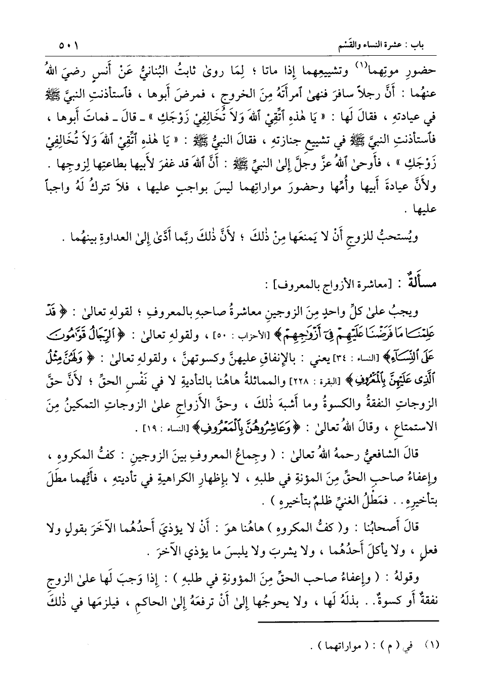 ويجب على كل واحد من الزوجين معاشرة صاحبه بالمعروف؛ لِقَوْلِهِ تَعَالَى: {قَدْ عَلِمْنَا مَا فَرَضْنَا عَلَيْهِمْ فِي أَزْوَاجِهِمْ} [الأحزاب: 50] [الأحزاب:50] ، ولقوله تعالى: {الرِّجَالُ قَوَّامُونَ عَلَى النِّسَاءِ} [النساء: 34] [النساء:34] يعني: بالإنفاق عليهن وكسوتهن، ولقوله تعالى: {وَلَهُنَّ مِثْلُ الَّذِي عَلَيْهِنَّ بِالْمَعْرُوفِ} [البقرة: 228] [البقرة:228] والمماثلة هاهنا بالتأدية لا في نفس الحق؛ لأن حق الزوجات النفقة والكسوة وما أشبه ذلك، وحق الأزواج على الزوجات التمكين من الاستمتاع، وقال الله تعالى: {وَعَاشِرُوهُنَّ بِالْمَعْرُوفِ} [النساء: 19] [النساء:19] .
