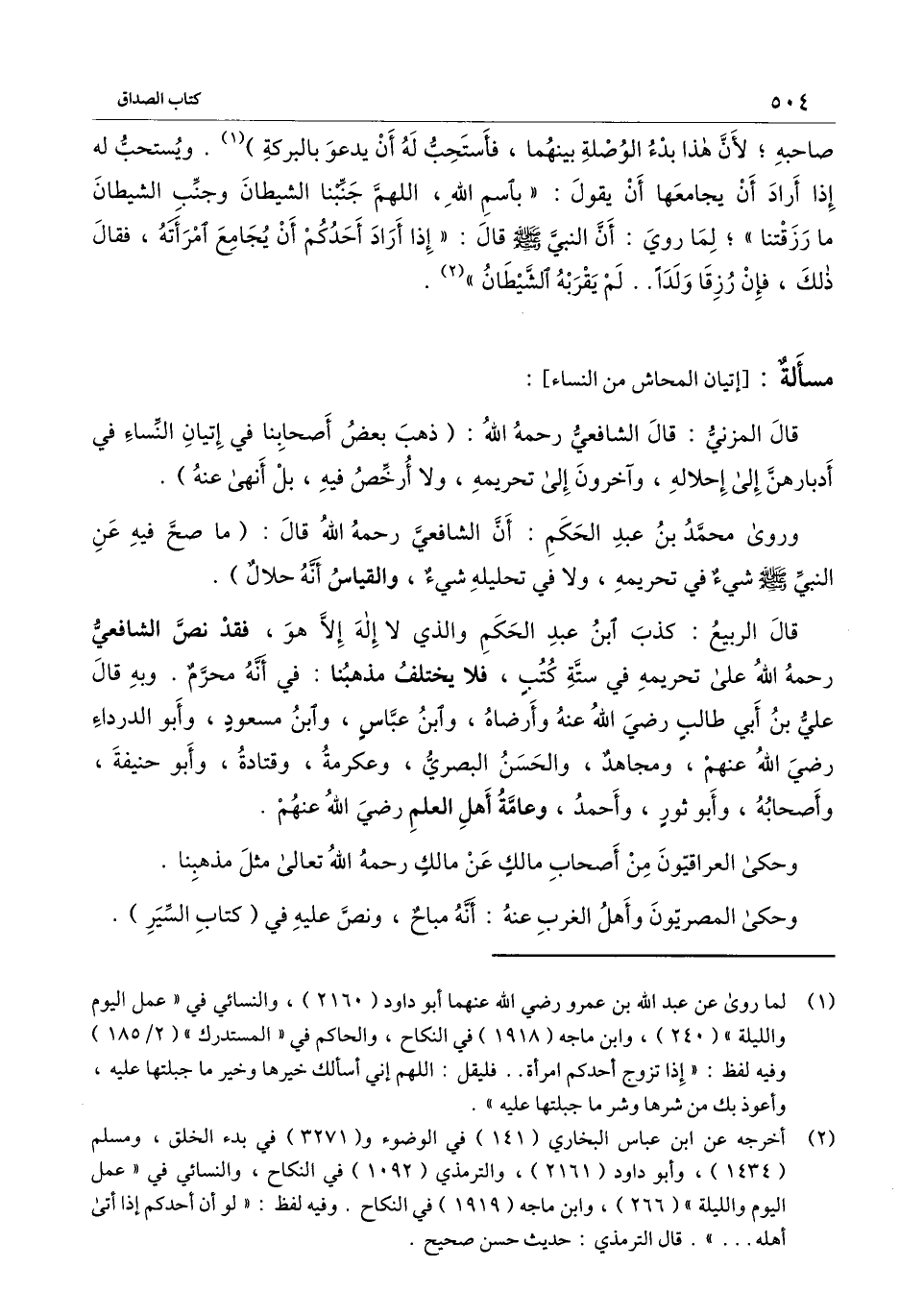 قال الربيع: كذب ابن عبد الحكم والذي لا إله إلا هو، فقد نص الشافعي - رَحِمَهُ اللَّهُ - على تحريمه في ستة كتب، فلا يختلف مذهبنا: في أنه محرم. وبه قال علي بن أبي طالب - رَضِيَ اللَّهُ عَنْهُ - وأرضاه -، وابن عباس، وابن مسعود، وأبو الدرداء - رَضِيَ اللَّهُ عَنْهُمْ -، ومجاهد، والحسن البصري، وعكرمة، وقتادة، وأبو حنيفة، وأصحابه، وأبو ثور، وأحمد، وعامة أهل العلم - رَضِيَ اللَّهُ عَنْهُمْ -.
