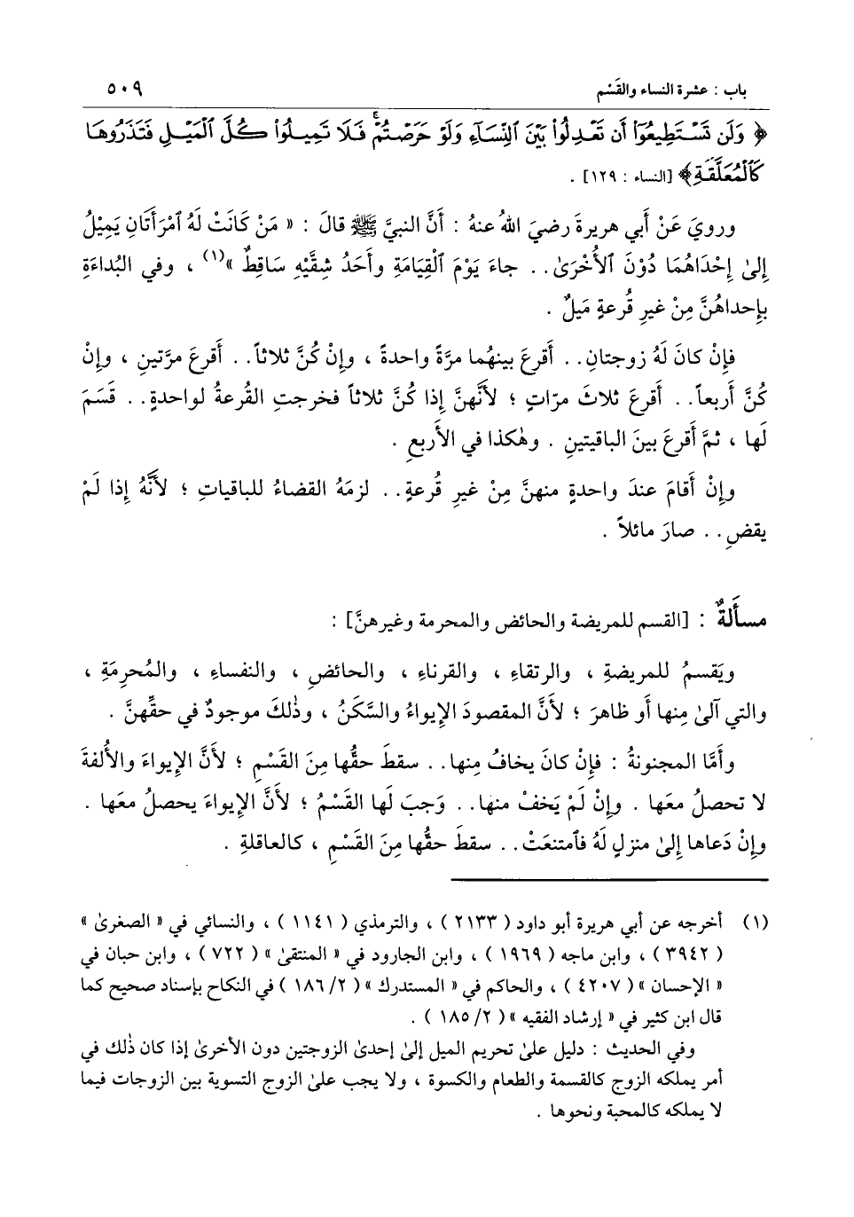 وروي عن أبي هريرة - رَضِيَ اللَّهُ عَنْهُ -: أن النبي - صَلَّى اللَّهُ عَلَيْهِ وَسَلَّمَ - قال: «من كانت له امرأتان يميل إلى إحداهما دون الأخرى.. جاء يوم القيامة وأحد شقيه ساقط» وفي البداءة بإحداهن من غير قرعة ميل.