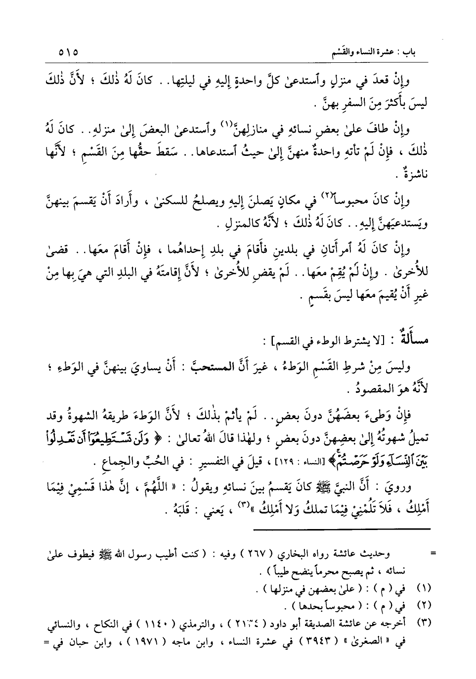 وروي: أن النبي - صَلَّى اللَّهُ عَلَيْهِ وَسَلَّمَ - كان يقسم بين نسائه ويقول: «اللهم، إن هذا قسمي فيما أملك، فلا تلمني فيما تملك ولا أملك» ، يعني: قلبه.
