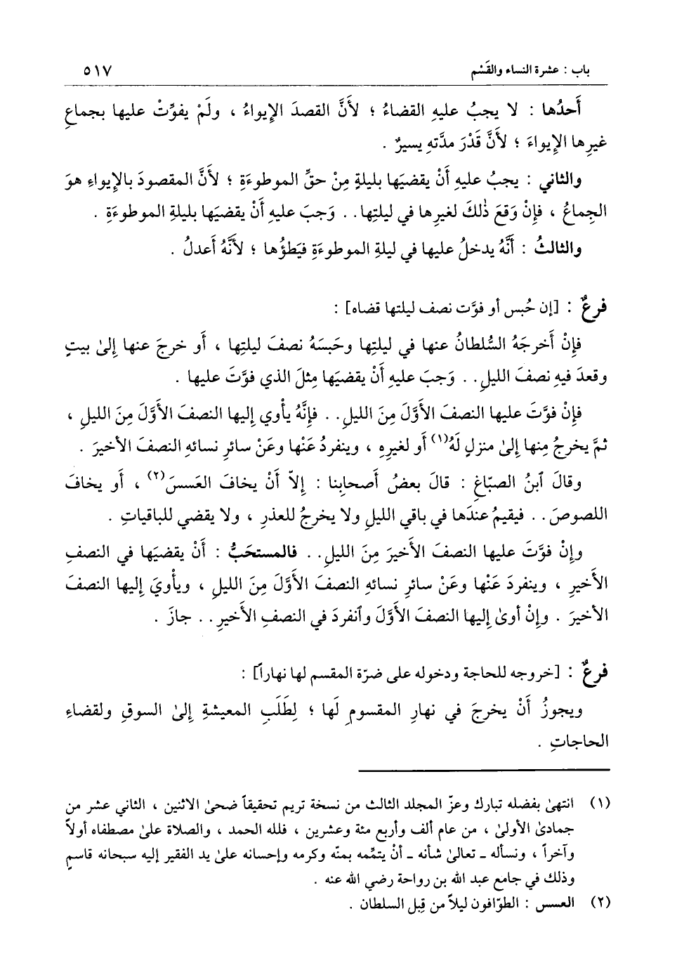 فإن أخرجه السلطان عنها في ليلتها وحبسه نصف ليلتها، أو خرج عنها إلى بيت وقعد فيه نصف الليل.. وجب عليه أن يقضيها مثل الذي فوت عليها.