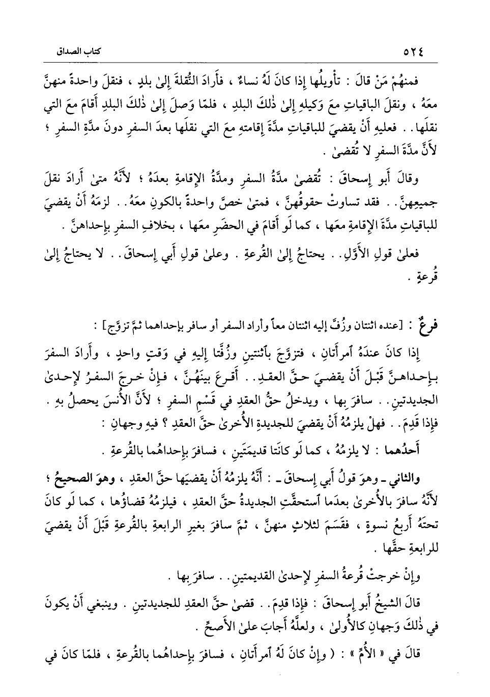 وقال أبو إسحاق: تقضى مدة السفر ومدة الإقامة بعده؛ لأنه متى أراد نقل جميعهن.. فقد تساوت حقوقهن، فمتى خص واحدة بالكون معه.. لزمه أن يقضي للباقيات مدة الإقامة معها، كما لو أقام في الحضر معها، بخلاف السفر بإحداهن.