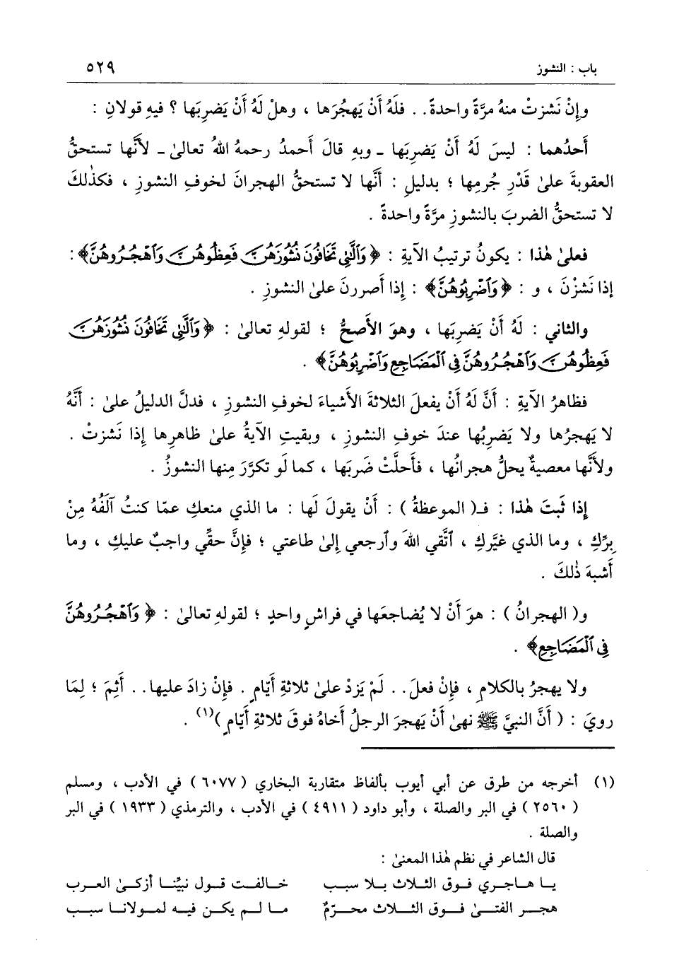 و (الهجران) : هو أن لا يضاجعها في فراش واحد؛ لِقَوْلِهِ تَعَالَى: {وَاهْجُرُوهُنَّ فِي الْمَضَاجِعِ} [النساء: 34] ..