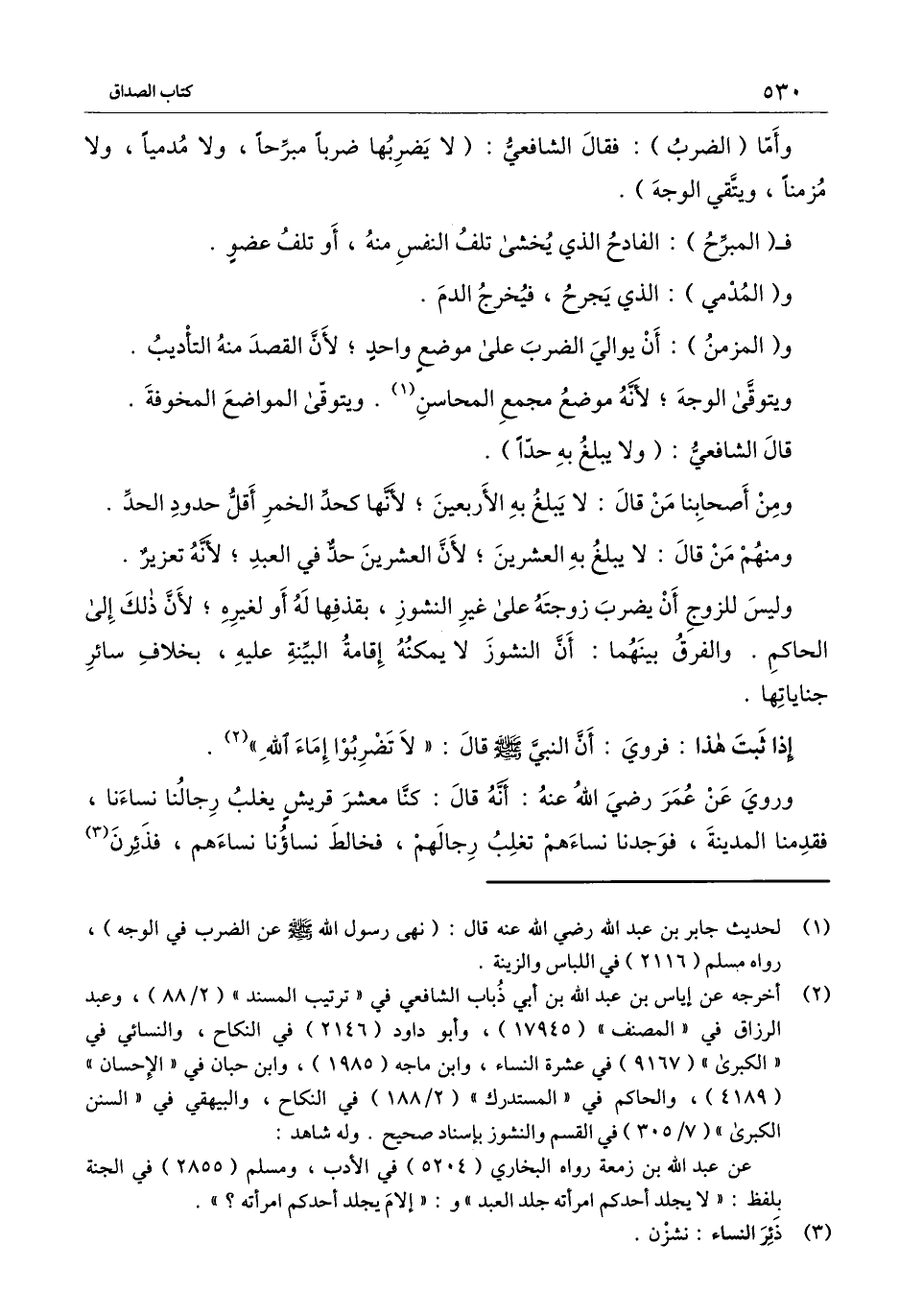 وأما (الضرب) : فقال الشافعي: (لا يضربها ضربًا مبرحًا، ولا مدميًا، ولا مزمنًا، ويتقي الوجه) .