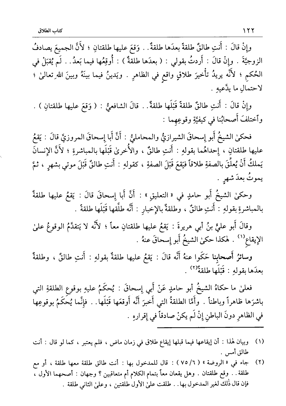 وإن قال: أنت طالق طلقة بعدها طلقة.. وقع عليها طلقتان؛ لأن الجميع يصادف الزوجية. وإن قال: أردت بقولي: (بعدها طلقة) : أوقعها فيما بعد.. لم يقبل في الحكم؛ لأنه يريد تأخير طلاق واقع في الظاهر. ويدين فيما بينه وبين الله تعالى؛ لاحتمال ما يدعيه.