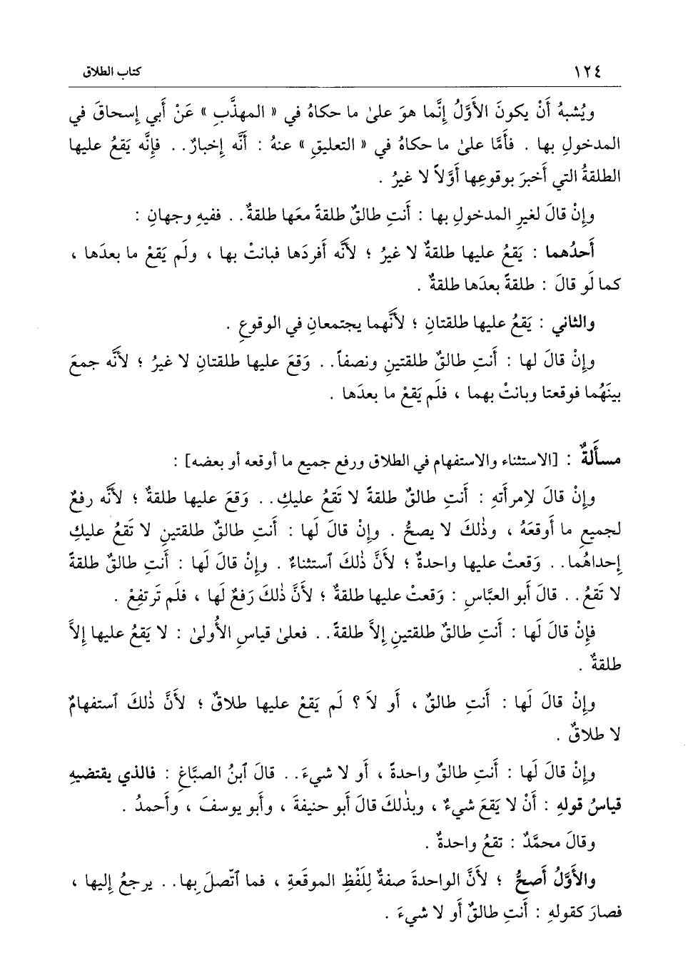 ] : وإن قال لامرأته: أنت طالق طلقة لا تقع عليك.. وقع عليها طلقة؛ لأنه رفع لجميع ما أوقعه، وذلك لا يصح. وإن قال لها: أنت طالق طلقتين لا تقع عليك إحداهما.. وقعت عليها واحدة؛ لأن ذلك استثناء. وإن قال لها: أنت طالق طلقة لا تقع.. قال أبو العباس: وقعت عليها طلقة؛ لأن ذلك رفع لها، فلم ترتفع.