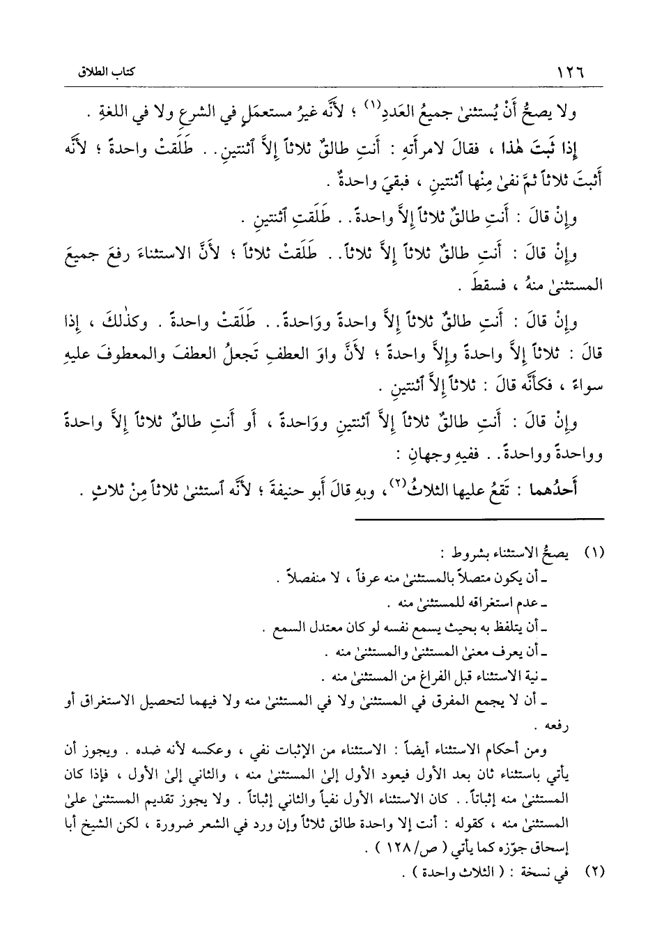 إذا ثبت هذا، فقال لامرأته: أنت طالق ثلاثا إلا اثنتين.. طلقت واحدة؛ لأنه أثبت ثلاثا ثم نفى منها اثنتين، فبقي واحدة.