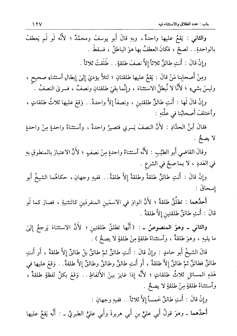 وقال القاضي أبو الطيب: لأنه استثناء واحدة من نصف؛ لأن الاعتبار بالمنطوق به في العدد، لا بما صح في الشرع.
