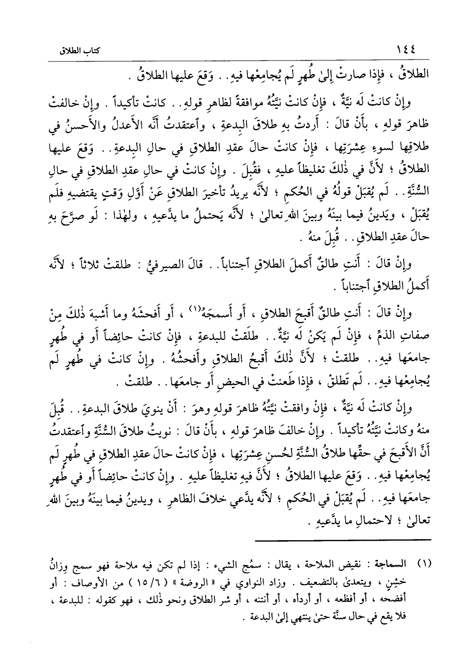 وإن كانت له نية، فإن وافقت نيته ظاهر قوله وهو: أن ينوي طلاق البدعة.. قبل منه وكانت نيته تأكيدا. وإن خالف ظاهر قوله، بأن قال: نويت طلاق السنة واعتقدت أن الأقبح في حقها طلاق السنة لحسن عشرتها، فإن كانت حال عقد الطلاق في طهر لم يجامعها فيه.. وقع عليها الطلاق؛ لأن فيه تغليظا عليه. وإن كانت حائضا أو في طهر جامعها فيه.. لم يقبل في الحكم؛ لأنه يدعي خلاف الظاهر، ويدين فيما بينه وبين الله تعالى؛ لاحتمال ما يدعيه.