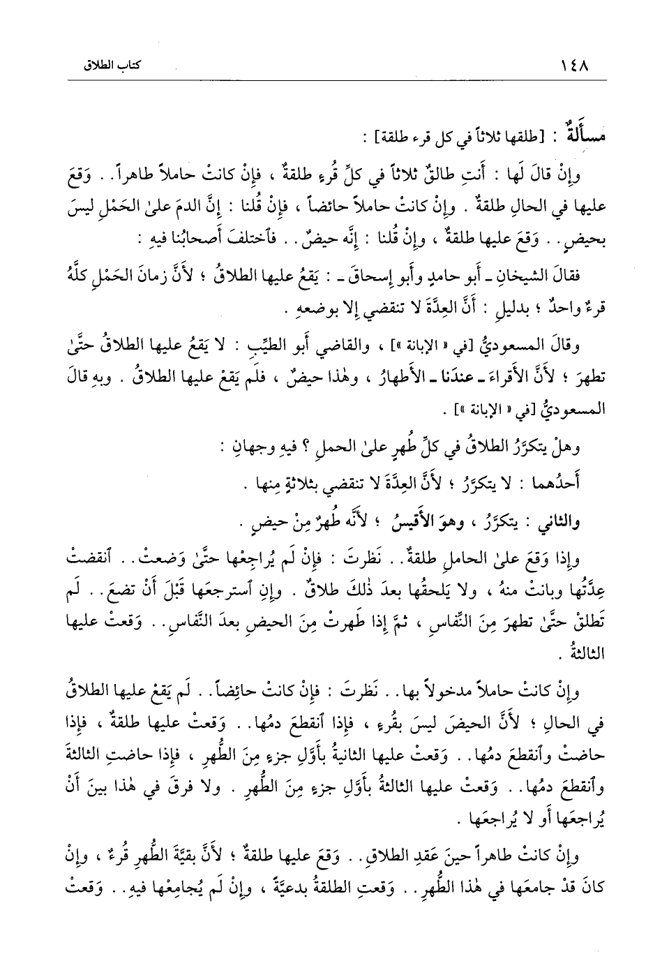 وإن كانت حاملا مدخولا بها.. نظرت: فإن كانت حائضا.. لم يقع عليها الطلاق في الحال؛ لأن الحيض ليس بقرء، فإذا انقطع دمها.. وقعت عليها طلقة، فإذا حاضت وانقطع دمها.. وقعت عليها الثانية بأول جزء من الطهر، فإذا حاضت الثالثة وانقطع دمها.. وقعت عليها الثالثة بأول جزء من الطهر. ولا فرق في هذا بين أن يراجعها أو لا يراجعها.