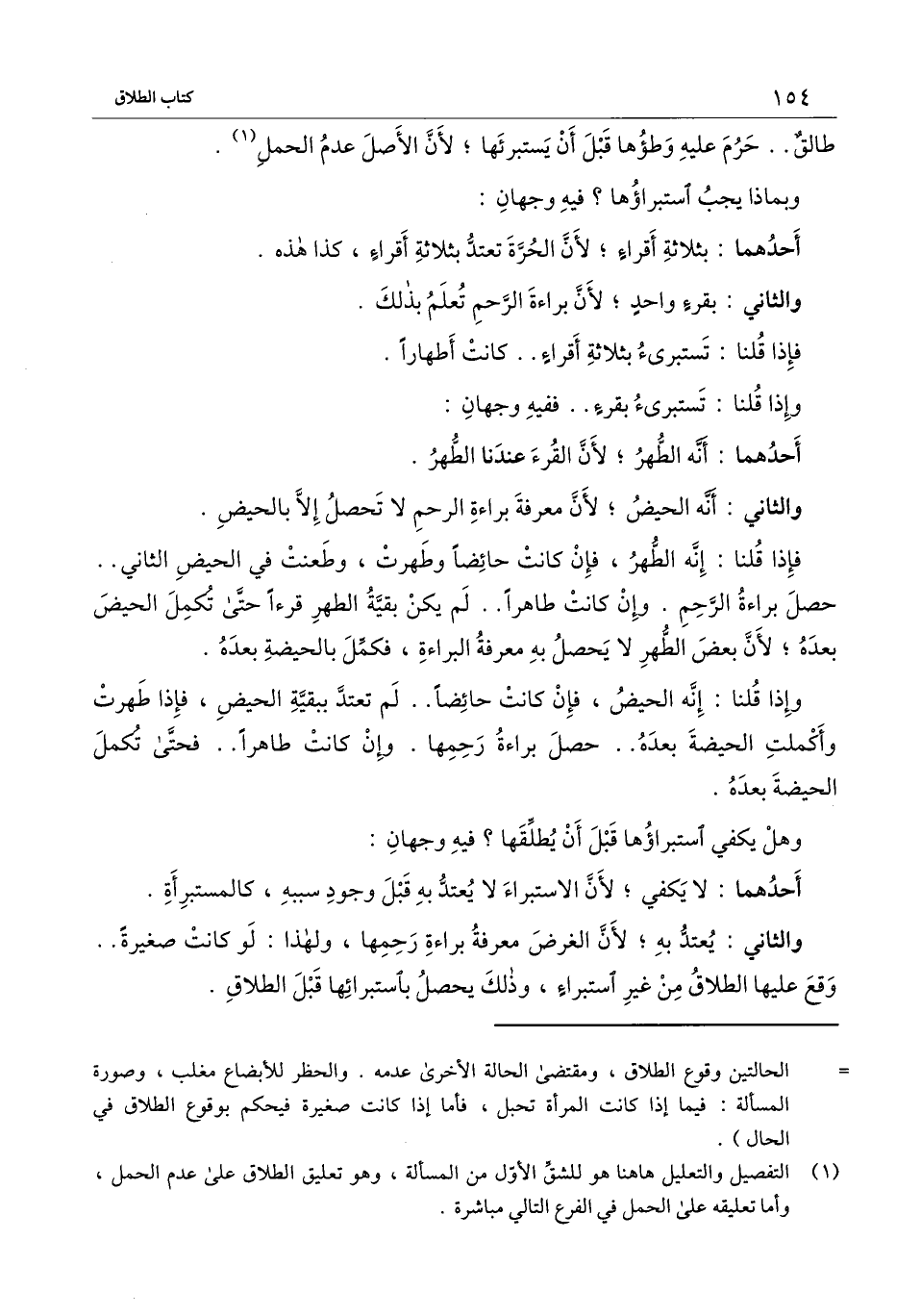 فإذا قلنا: إنه الطهر، فإن كانت حائضا وطهرت، وطعنت في الحيض الثاني.. حصل براءة الرحم. وإن كانت طاهرا.. لم يكن بقية الطهر قرءا حتى تكمل الحيض بعده؛ لأن بعض الطهر لا يحصل به معرفة البراءة، فكمل بالحيضة بعده.