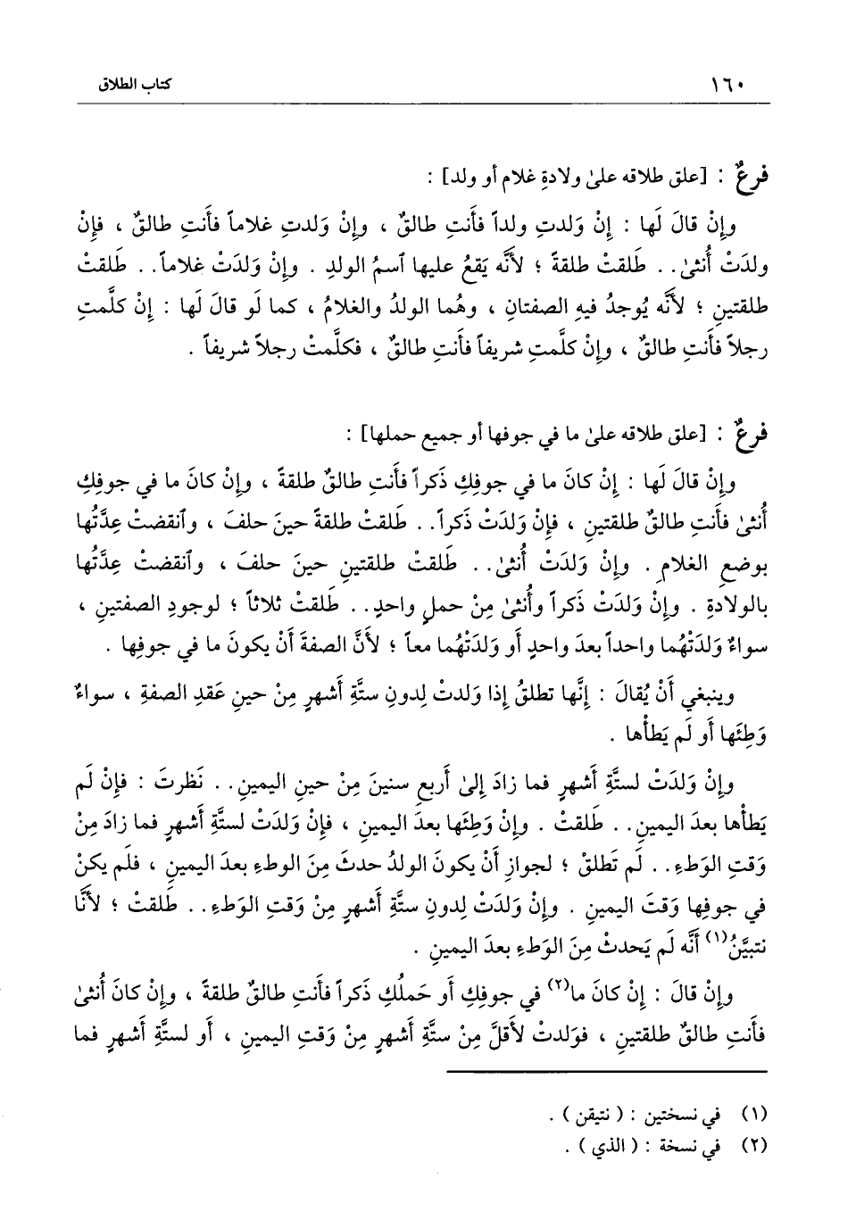 وإن قال لها: إن ولدت ولدا فأنت طالق، وإن ولدت غلاما فأنت طالق، فإن ولدت أنثى.. طلقت طلقة؛ لأنه يقع عليها اسم الولد. وإن ولدت غلاما.. طلقت طلقتين؛ لأنه يوجد فيه الصفتان، وهما الولد والغلام، كما لو قال لها: إن كلمت رجلا فأنت طالق، وإن كلمت شريفا فأنت طالق، فكلمت رجلا شريفا.