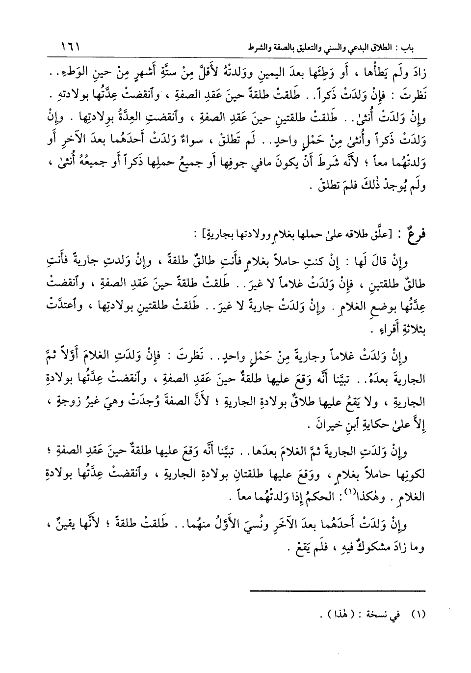 وإن ولدت الجارية ثم الغلام بعدها.. تبينا أنه وقع عليها طلقة حين عقد الصفة؛ لكونها حاملا بغلام، ووقع عليها طلقتان بولادة الجارية، وانقضت عدتها بولادة الغلام. وهكذا: الحكم إذا ولدتهما معا.