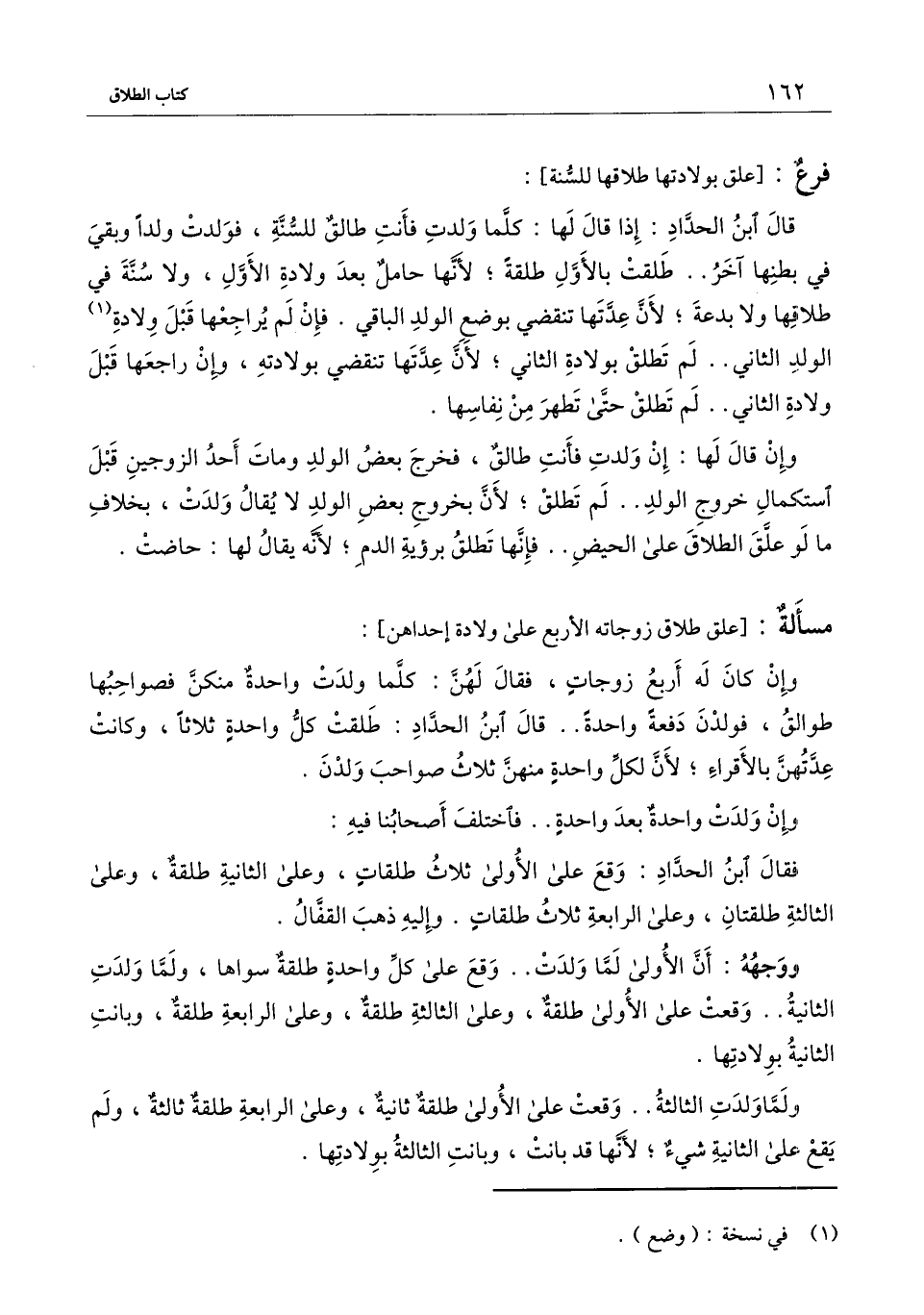 قال ابن الحداد: إذا قال لها: كلما ولدت فأنت طالق للسنة، فولدت ولدا وبقي في بطنها آخر.. طلقت بالأول طلقة؛ لأنها حامل بعد ولادة الأول، ولا سنة في طلاقها ولا بدعة؛ لأن عدتها تنقضي بوضع الولد الباقي. فإن لم يراجعها قبل ولادة الولد الثاني.. لم تطلق بولادة الثاني؛ لأن عدتها تنقضي بولادته، وإن راجعها قبل ولادة الثاني.. لم تطلق حتى تطهر من نفاسها.