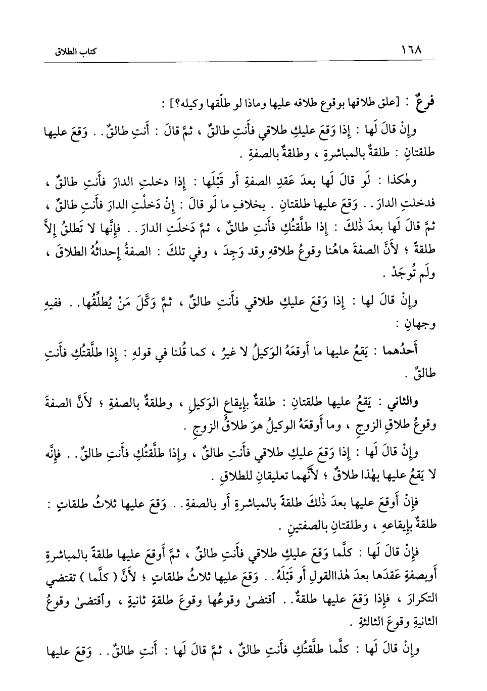 فإن قال لها: كلما وقع عليك طلاقي فأنت طالق، ثم أوقع عليها طلقة بالمباشرة أو بصفة عقدها بعد هذا القول أو قبله ... وقع عليها ثلاث طلقات؛ لأن (كلما) تقتضي التكرار، فإذا وقع عليها طلقة.. اقتضى وقوعها وقوع طلقة ثانية، واقتضى وقوع الثانية وقوع الثالثة.