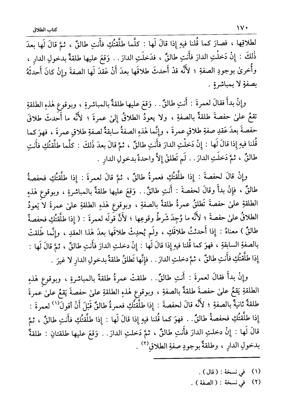 وإن بدأ فقال لعمرة: أنت طالق.. طلقت عمرة طلقة بالمباشرة، وبوقوع هذه الطلقة يقع على حفصة طلقة بالصفة، وبوقوع هذه الطلقة على حفصة يقع على عمرة طلقة ثانية بالصفة؛ لأنه قال لحفصة: إذا طلقتك فعمرة طالق قبل أن أقول لعمرة: إذا طلقتك فحفصة طالق.. فهو كما قلنا فيه إذا قال لها: إذا طلقتك فأنت طالق، ثم قال لها: إن دخلت الدار فأنت طالق، ثم دخلت الدار.. وقع عليها طلقتان: طلقة بدخول الدار، وطلقة بوجود صفة الطلاق.