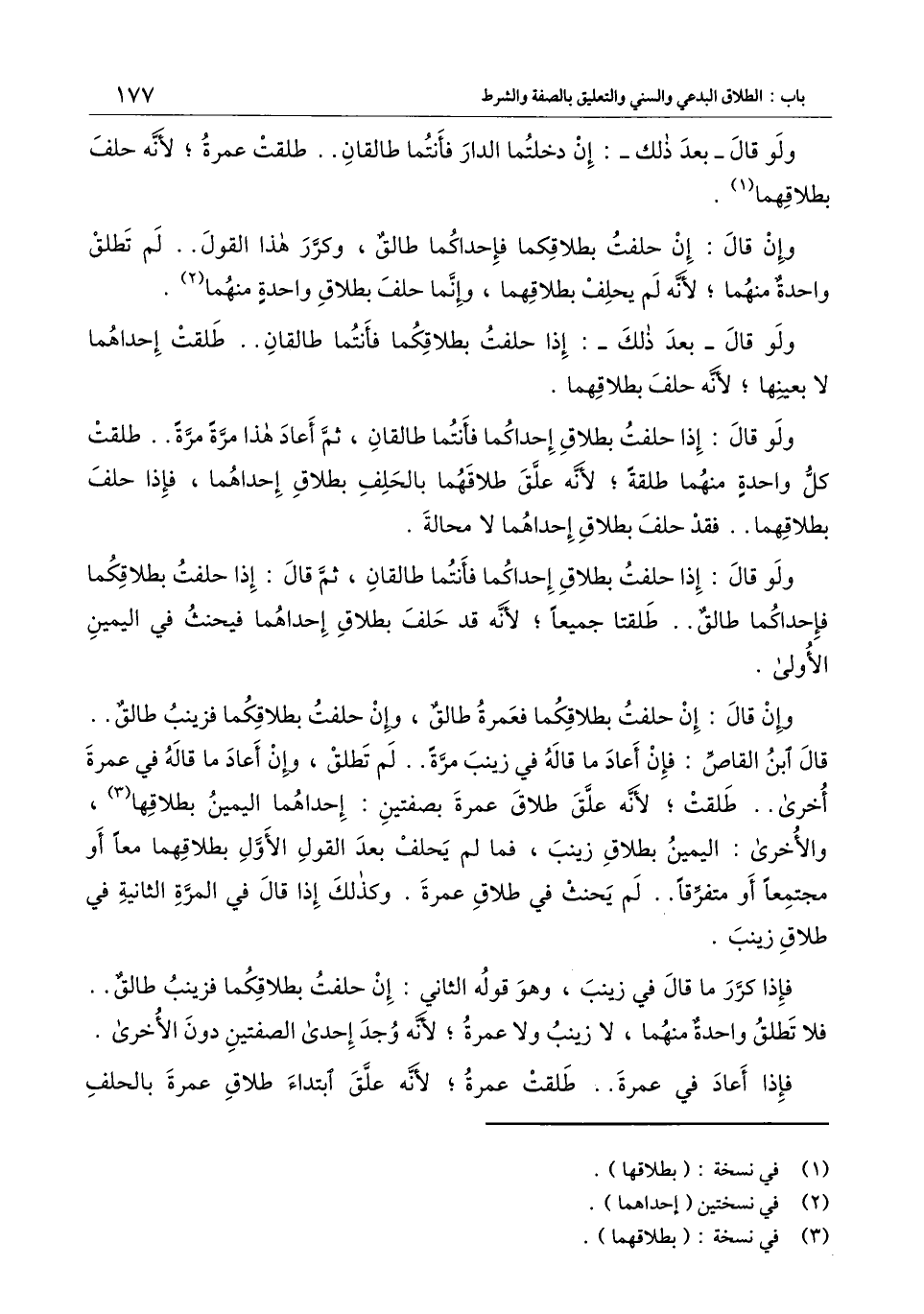 وإن قال: إن حلفت بطلاقكما فعمرة طالق، وإن حلفت بطلاقكما فزينب طالق.. قال ابن القاص: فإن أعاد ما قاله في زينب مرة.. لم تطلق، وإن أعاد ما قاله في عمرة أخرى.. طلقت؛ لأنه علق طلاق عمرة بصفتين: إحداهما اليمين بطلاقها، والأخرى: اليمين بطلاق زينب، فما لم يحلف بعد القول الأول بطلاقهما معا أو مجتمعا أو متفرقا.. لم يحنث في طلاق عمرة. وكذلك إذا قال في المرة الثانية في طلاق زينب.