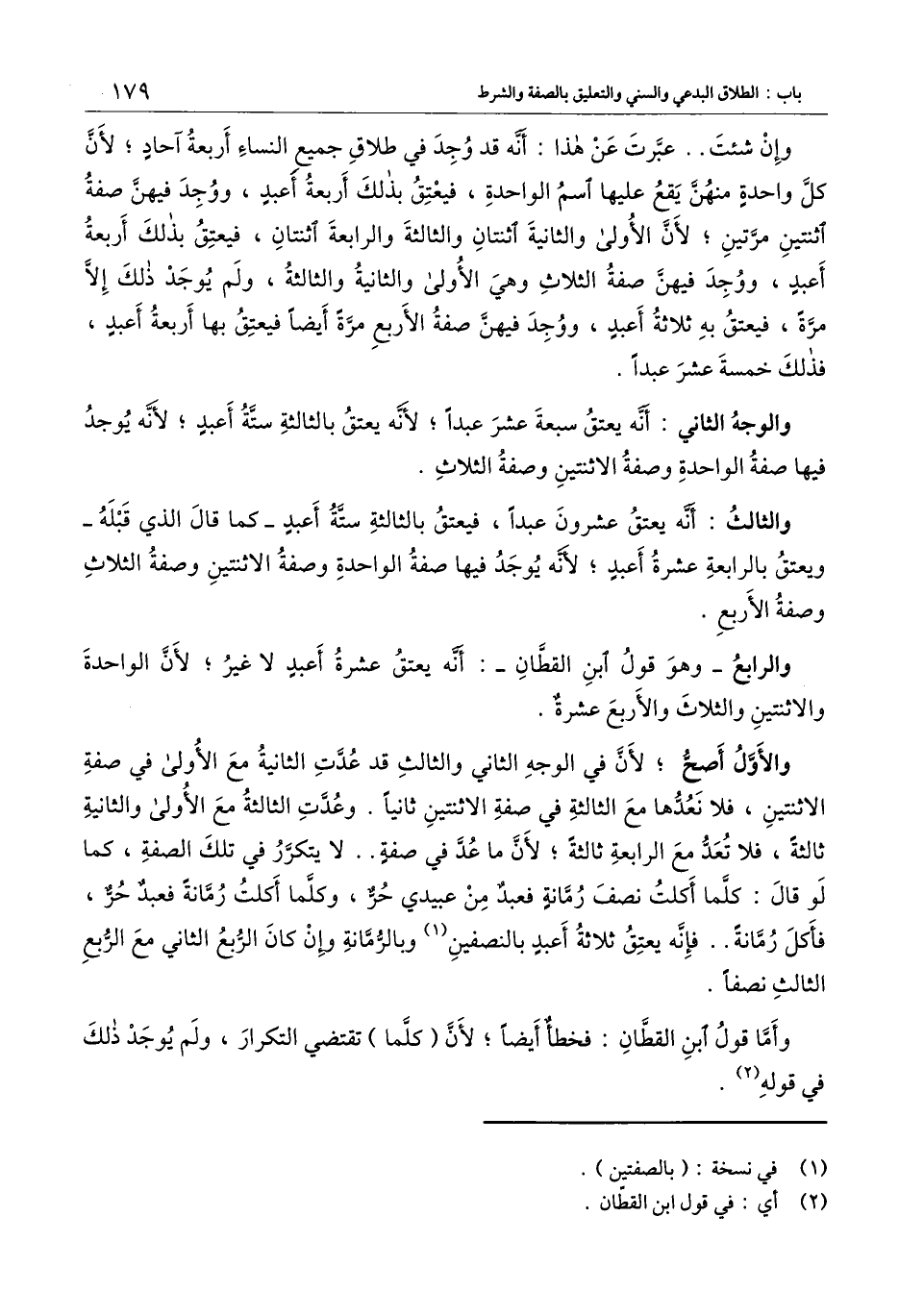 وإن شئت.. عبرت عن هذا: أنه قد وجد في طلاق جميع النساء أربعة آحاد؛ لأن كل واحدة منهن يقع عليها اسم الواحدة، فيعتق بذلك أربعة أعبد، ووجد فيهن صفة اثنتين مرتين؛ لأن الأولى والثانية اثنتان والثالثة والرابعة اثنتان، فيعتق بذلك أربعة أعبد، ووجد فيهن صفة الثلاث وهي الأولى والثانية والثالثة، ولم يوجد ذلك إلا مرة، فيعتق به ثلاثة أعبد، ووجد فيهن صفة الأربع مرة أيضا فيعتق بها أربعة أعبد، فذلك خمسة عشر عبدا.