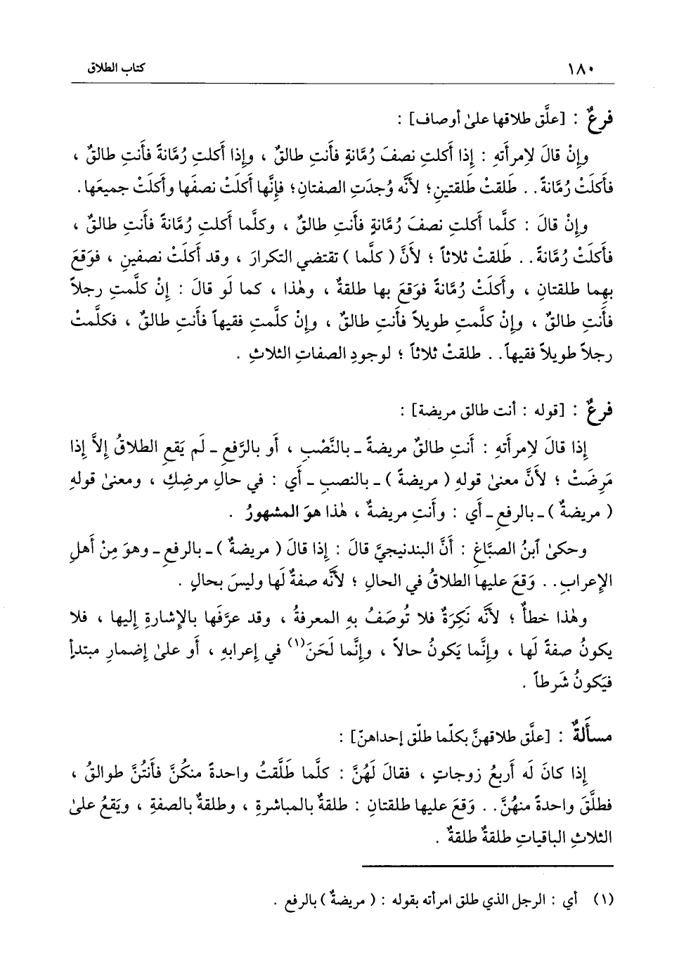 إذا قال لامرأته: أنت طالق مريضة - بالنصب، أو بالرفع - لم يقع الطلاق إلا إذا مرضت؛ لأن معنى قوله (مريضة) - بالنصب - أي: في حال مرضك، ومعنى قوله (مريضة) - بالرفع - أي: وأنت مريضة، هذا هو المشهور.