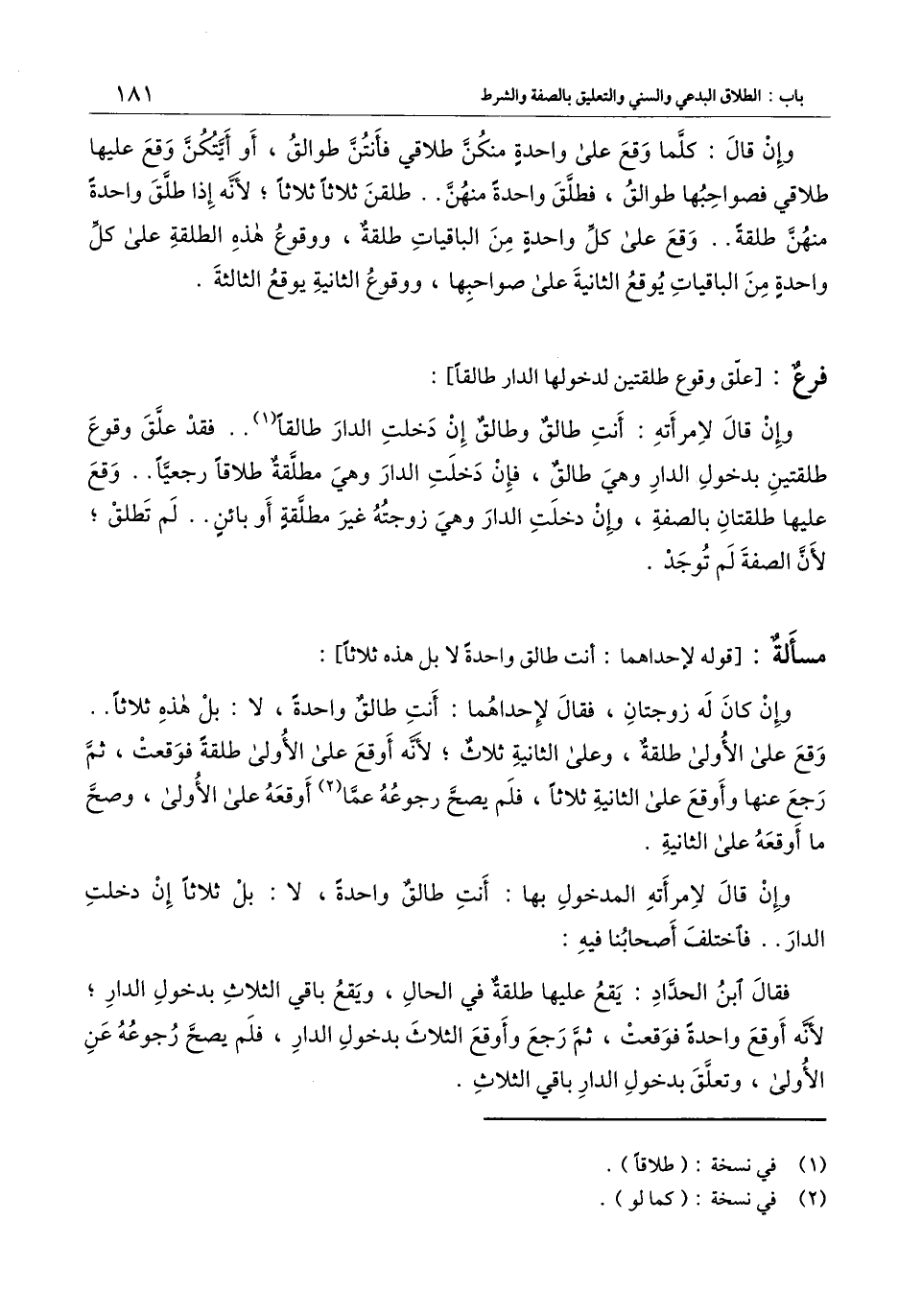 وإن قال لامرأته: أنت طالق وطالق إن دخلت الدار طالقا.. فقد علق وقوع طلقتين بدخول الدار وهي طالق، فإن دخلت الدار وهي مطلقة طلاقا رجعيا.. وقع عليها طلقتان بالصفة، وإن دخلت الدار وهي زوجته غير مطلقة أو بائن.. لم تطلق؛ لأن الصفة لم توجد.