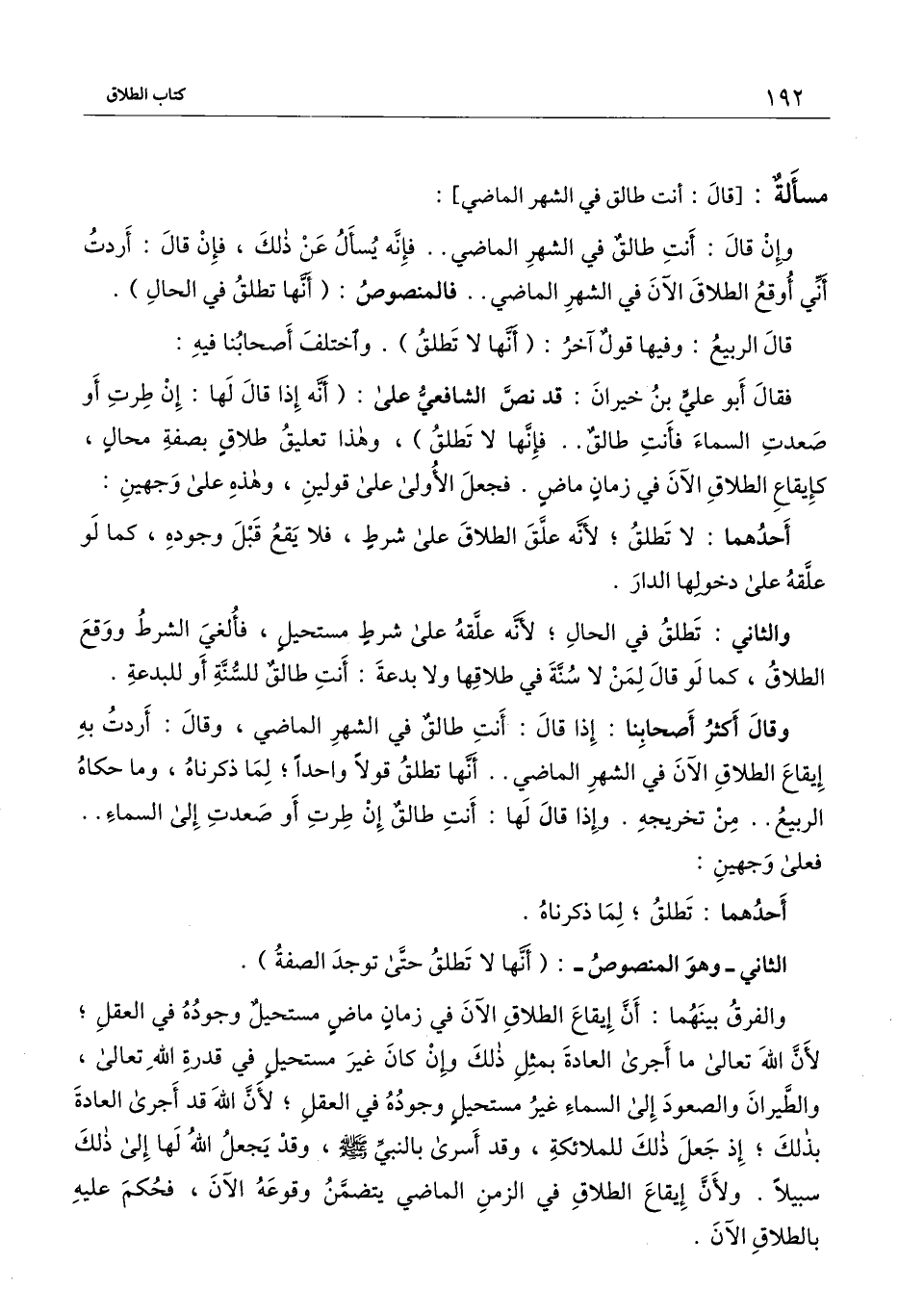 وقال أكثر أصحابنا: إذا قال: أنت طالق في الشهر الماضي، وقال: أردت به إيقاع الطلاق الآن في الشهر الماضي.. أنها تطلق قولا واحدا؛ لما ذكرناه، وما حكاه الربيع.. من تخريجه. وإذا قال لها: أنت طالق إن طرت أو صعدت إلى السماء.. فعلى وجهين: