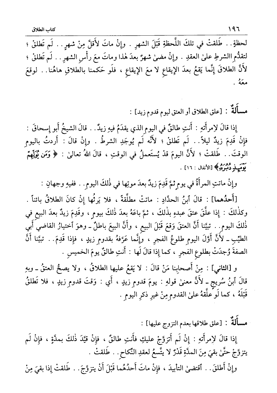 و [الثاني] : من أصحابنا من قال: لا يقع عليها الطلاق، ولا يصح العتق - وبه قال ابن سريج - لأن معنى قوله: يوم قدوم زيد، أي: وقت قدوم زيد، فلا تطلق قبله، كما لو علقه على القدوم من غير ذكر اليوم.