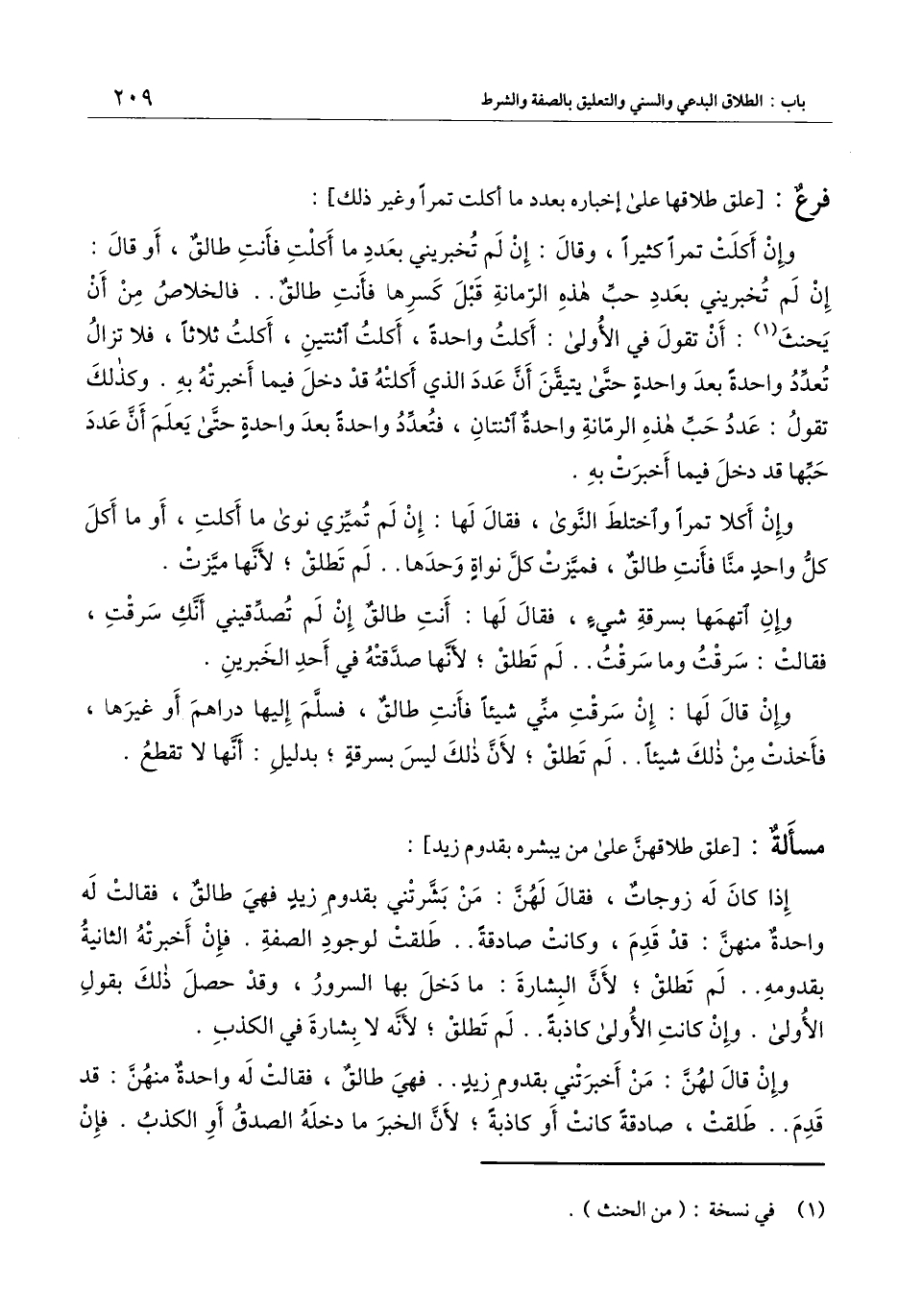 إذا كان له زوجات، فقال لهن: من بشرتني بقدوم زيد فهي طالق، فقالت له واحدة منهن: قد قدم، وكانت صادقة.. طلقت لوجود الصفة. فإن أخبرته الثانية بقدومه.. لم تطلق؛ لأن البشارة: ما دخل بها السرور، وقد حصل ذلك بقول الأولى. وإن كانت الأولى كاذبة.. لم تطلق؛ لأنه لا بشارة في الكذب.