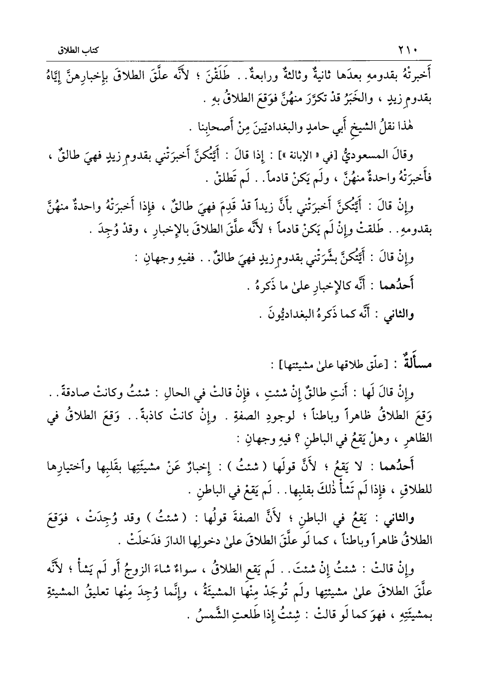 وإن قال لها: أنت طالق إن شئت، فإن قالت في الحال: شئت وكانت صادقة.. وقع الطلاق ظاهرا وباطنا؛ لوجود الصفة. وإن كانت كاذبة.. وقع الطلاق في الظاهر، وهل يقع في الباطن؟ فيه وجهان: