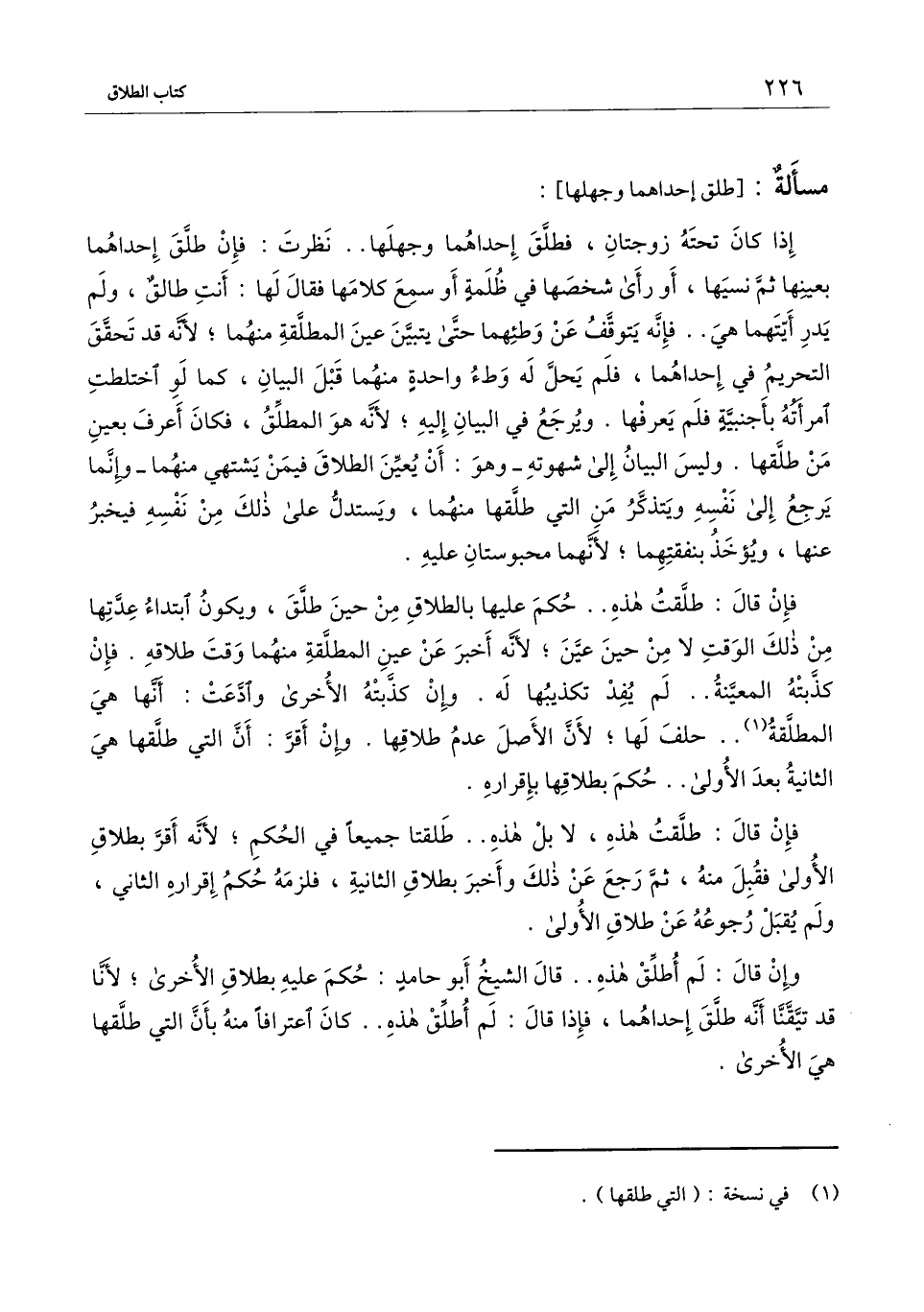 إذا كان تحته زوجتان، فطلق إحداهما وجهلها.. نظرت: فإن طلق إحداهما بعينها ثم نسيها، أو رأى شخصها في ظلمة أو سمع كلامها فقال لها: أنت طالق، ولم يدر أيتهما هي.. فإنه يتوقف عن وطئهما حتى يتبين عين المطلقة منهما؛ لأنه قد تحقق التحريم في إحداهما، فلم يحل له وطء واحدة منهما قبل البيان، كما لو اختلطت امرأته بأجنبية فلم يعرفها. ويرجع في البيان إليه؛ لأنه هو المطلق، فكان أعرف بعين من طلقها. وليس البيان إلى شهوته - وهو: أن يعين الطلاق فيمن يشتهي منهما - وإنما يرجع إلى نفسه ويتذكر من التي طلقها منهما، ويستدل على ذلك من نفسه فيخبر عنها، ويؤخذ بنفقتهما؛ لأنهما محبوستان عليه.